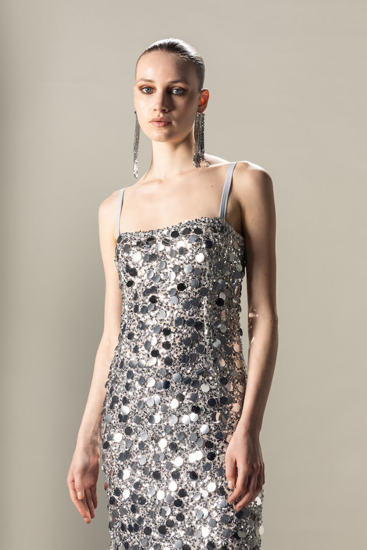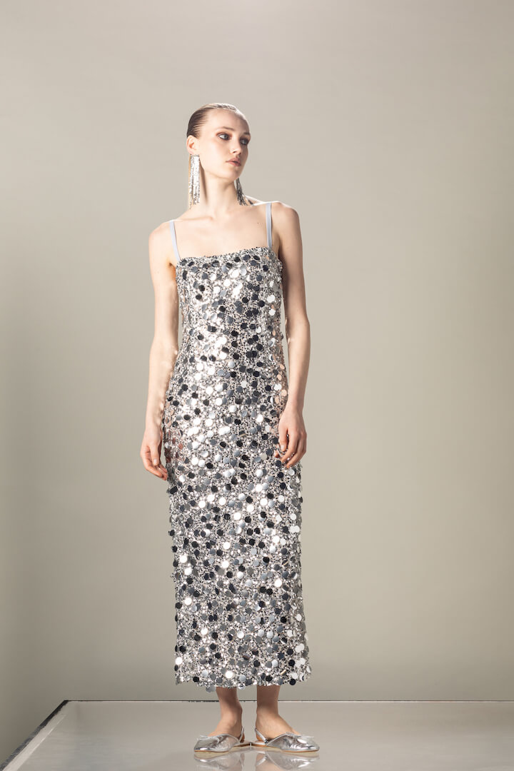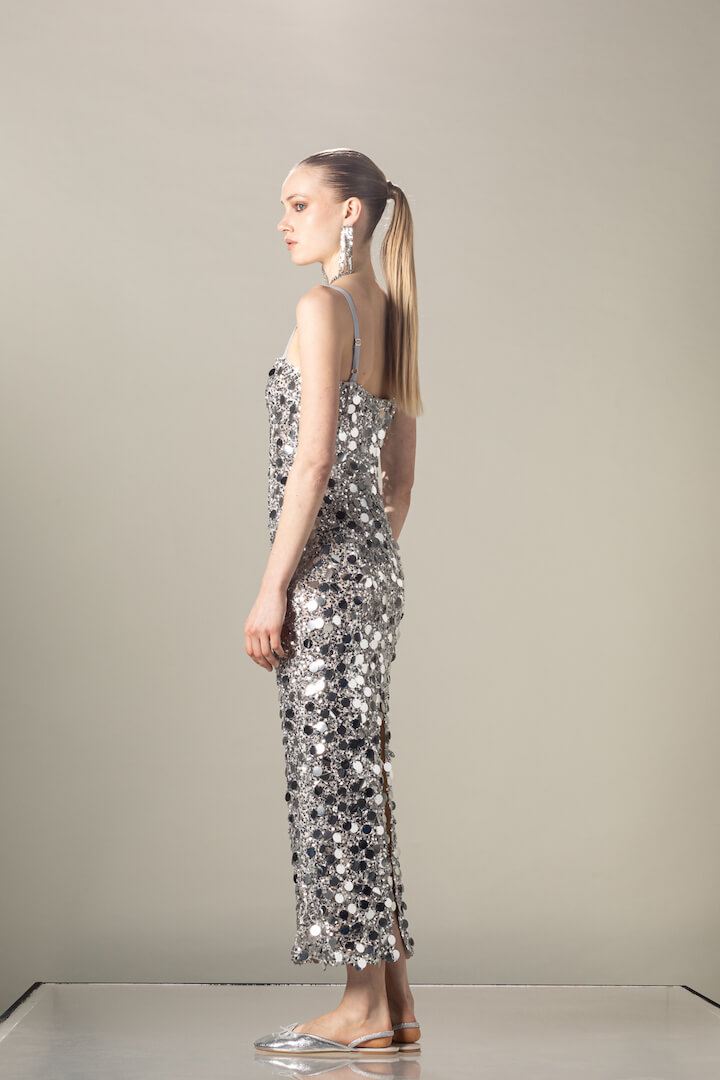 Φόρεμα στενό midi με παγιέτα φοδραρισμένο εσωτερικά με τούλι ελαστικό. Έχει τιράντες από ύφασμα που αυξομειώνονται, σκίσιμο πίσω και κουμπώνει με φερμουάρ στην πλάτη.