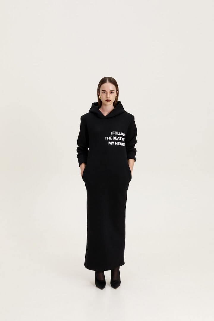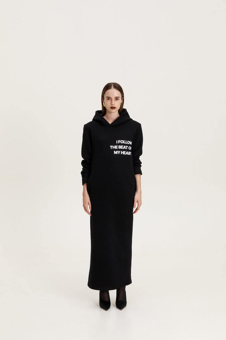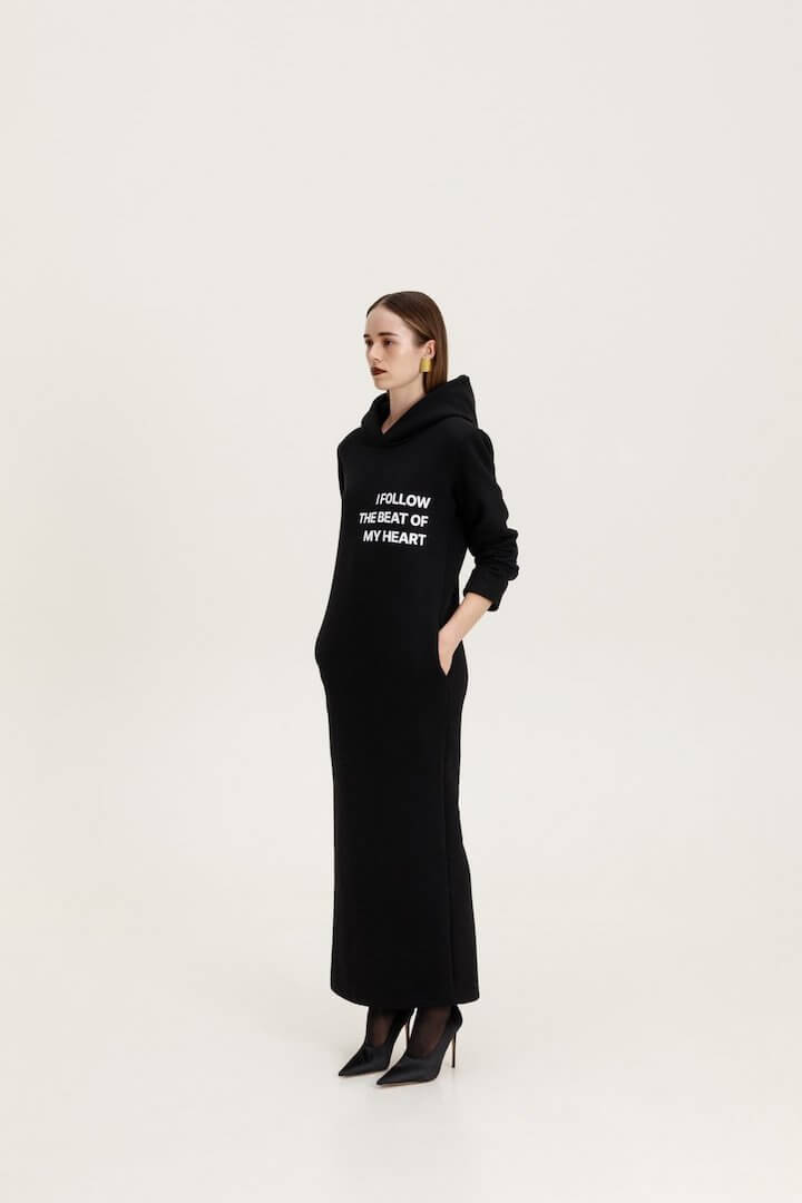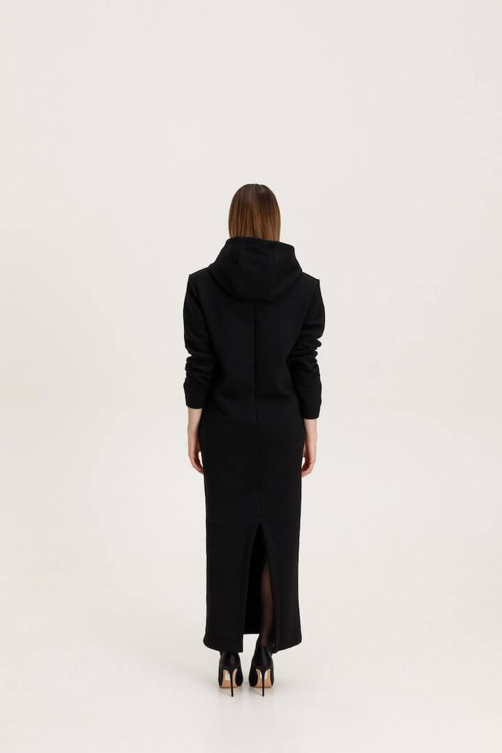 Φούτερ φόρεμα με κουκούλα σε ίσια γραμμή. Έχει έντονους ώμους με αποσπώμενες βάτες και τσέπες στο πλάι.