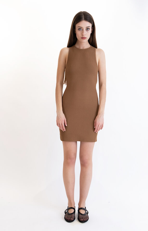 Γυναικείο mini πλεκτό rib φόρεμα σε εφαρμοστή γραμμή που κολακεύει την γυνακεία σιλουέτα και φοριέται άνοιξη καλοκαίρι και φθινόπωρο. Διαθέτει χοντρές τιράντες και ειδικά νήματα αναδεικνύοντας το κάθε σωματότυπο.
