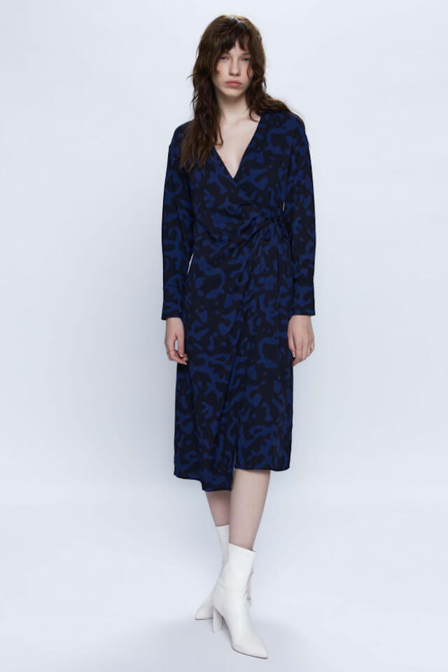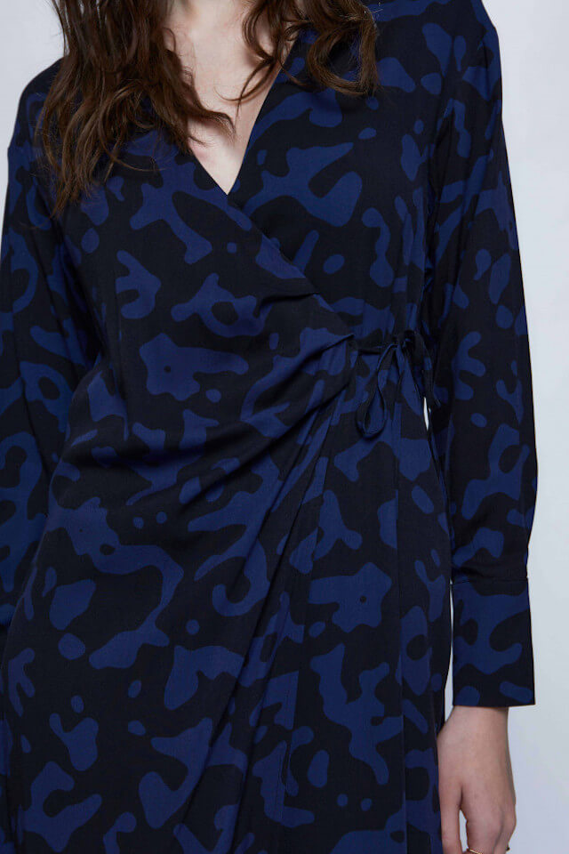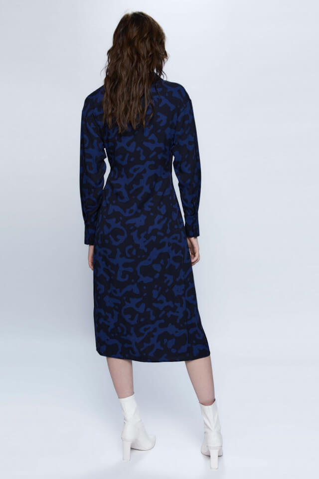 Μπλε μίντι φόρεμα με στάμπα με V λαιμόκοψη και μακριά μανίκια με κουμπωτή μανσέτα. Το μοντέλο είναι σταυρωμένο στη μέση με κορδόνι περίσφιξης. Το μοντέλο έχει ύψος 178 cm και φοράει νούμερο S.
