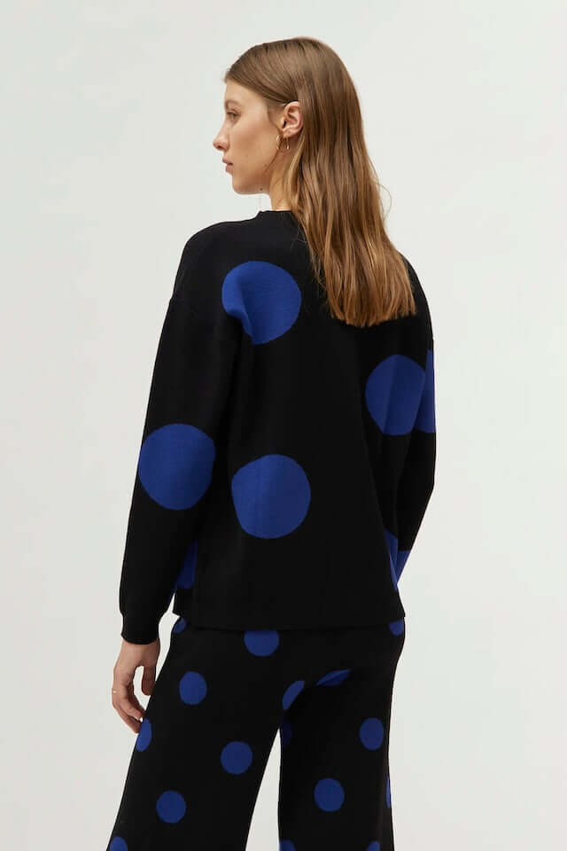 Μαύρο πλεκτό ζακάρ πουλόβερ με μπλε πουά στάμπα. Με στρογγυλή λαιμόκοψη και μακριά μανίκια.