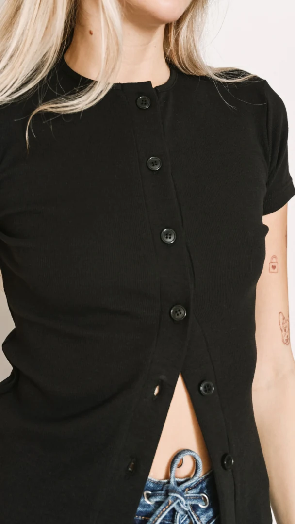 Το αγαπημένο basic της σεζόν, τώρα στην πιο κλασική και ευέλικτη εκδοχή του! Το Christy Black της Salt & Pepper Jeans είναι ένα μοντέρνο rib top με κοντά μανίκια και κομψό μπροστινό κλείσιμο με κουμπιά. Η εξαιρετικά ελαστική, ριμπ ύφανσή του (95% Cotton, 5% Elastane) αγκαλιάζει απαλά το σώμα και αναδεικνύει τη σιλουέτα, προσφέροντας απόλυτη άνεση χωρίς να σφίγγει. Το διαχρονικό μαύρο χρώμα του το μετατρέπει στο απόλυτο πασπαρτού της ντουλάπας σου. Συνδύασέ το με τα αγαπημένα σου wide-leg jeans αφήνοντας μερικά κουμπιά ανοιχτά για ένα χαλαρό στυλ, ή με μια μίνι φούστα και ankle boots για το απόλυτο minimal, σύγχρονο look.