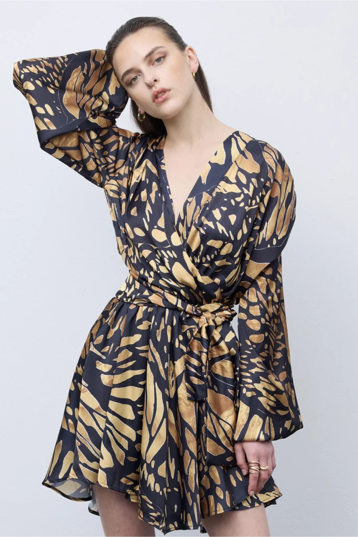 Το μίνι φόρεμα Butterfly Mosaic Wrap επαναπροσδιορίζει τη σύγχρονη κομψότητα με το εντυπωσιακό του σχέδιο και το ρευστό, κολακευτικό του σχέδιο. Κατασκευασμένο από ελαφρύ ύφασμα που εφαρμόζει όμορφα, αυτό το φόρεμα διαθέτει φαρδιά, φαρδιά, εντυπωσιακά μανίκια, που εξισορροπούν την τόλμη με την εκλεπτυσμένη άνεση. Ιδανικό για κομψότητα κατά τη διάρκεια της ημέρας ή για βραδινή γοητεία, είναι ένα κομμάτι που μεταβαίνει αβίαστα από τις βόλτες στην πόλη μέχρι τις βραδινές εμφανίσεις.