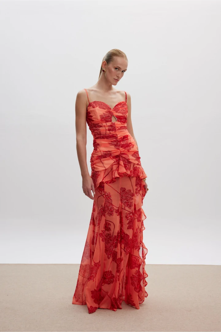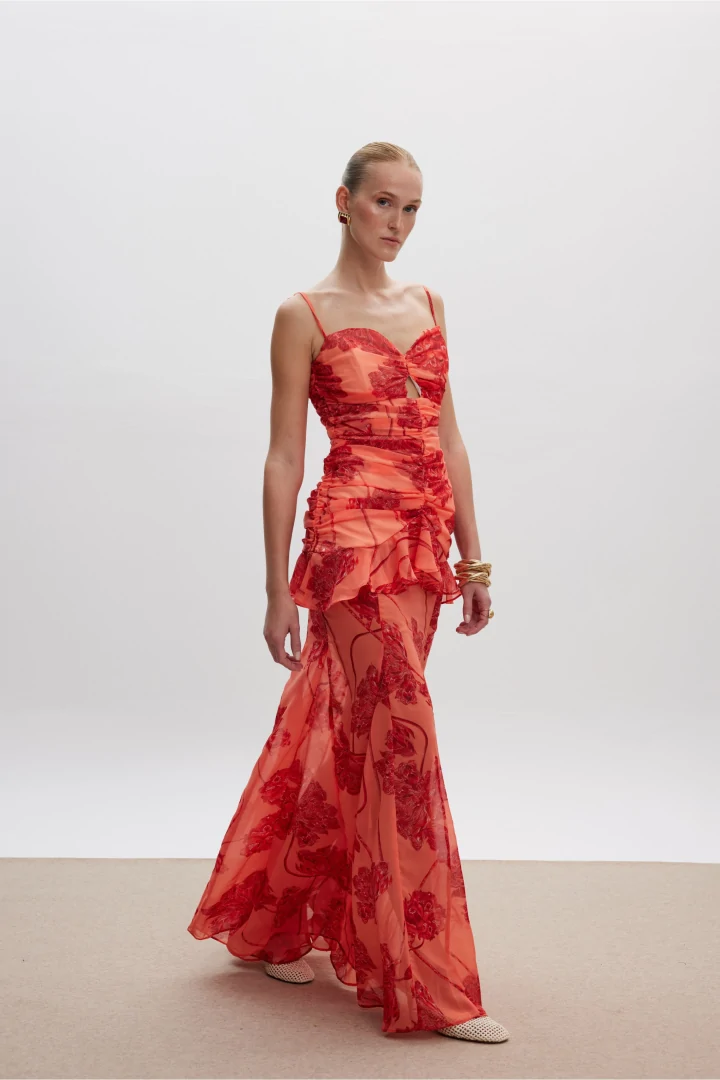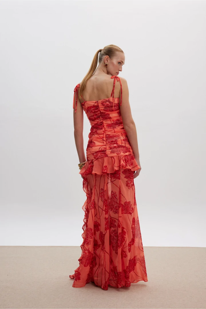 Το Lily Dress συνδυάζει ρομαντισμό και έντονη θηλυκότητα, με μια διακριτική vintage αισθητική που ξεχωρίζει. Σε ένα μοναδικό pattern με υπέροχες θερμές αποχρώσεις το maxi αυτό φόρεμα αγκαλιάζει το σώμα, με τις σούρες να τονίζουν την σιλουέτα και να δημιουργούν ένα κολακευτικό και δυναμικό look. Το μικρό άνοιγμα στο ντεκολτέ προσθέτει μια παιχνιδιάρικη αλλά εκλεπτυσμένη πινελιά, ενώ τα λεπτά ρυθμιζόμενα τιραντάκια και τα διακριτικά βολάν χαρίζουν κίνηση και κομψότητα.