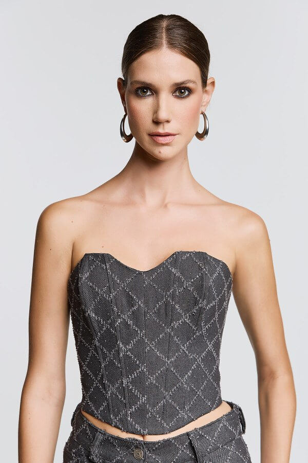Εντυπωσιάστε με το Charlize denim bustier διακοσμημένο με στρας, για μια εμφάνιση γεμάτη λάμψη! Φορέστε το μαζί με το Charlize Wide Leg jeans για ένα total elegant look που τραβάει τα βλέμματα. Ιδανικό για ξεχωριστές βραδινές εμφανίσεις.