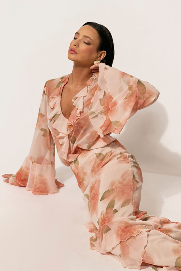 Η Iris Maxi Skirt είναι μια μάξι φούστα με μεσάτη γραμμή και διακριτικά βολάν που προσθέτουν κίνηση. Το floral print σε ροδακινί αποχρώσεις δίνει χαρακτήρα στο σχέδιο, ενώ το κλείσιμο με φερμουάρ πίσω προσφέρει σταθερή εφαρμογή.