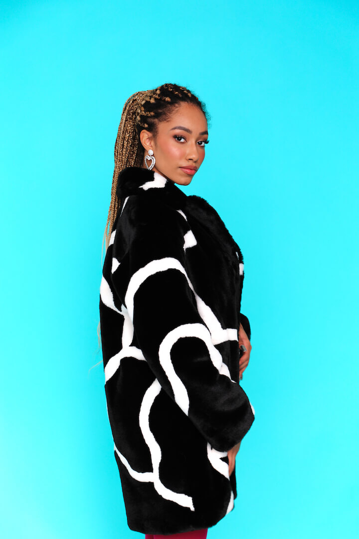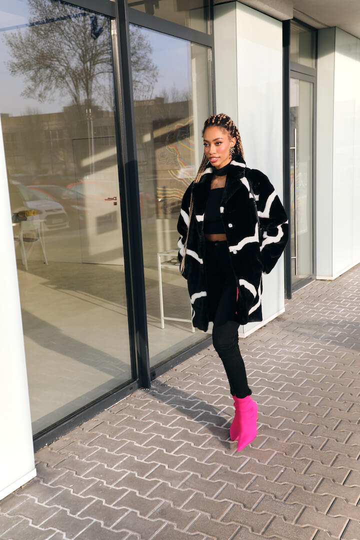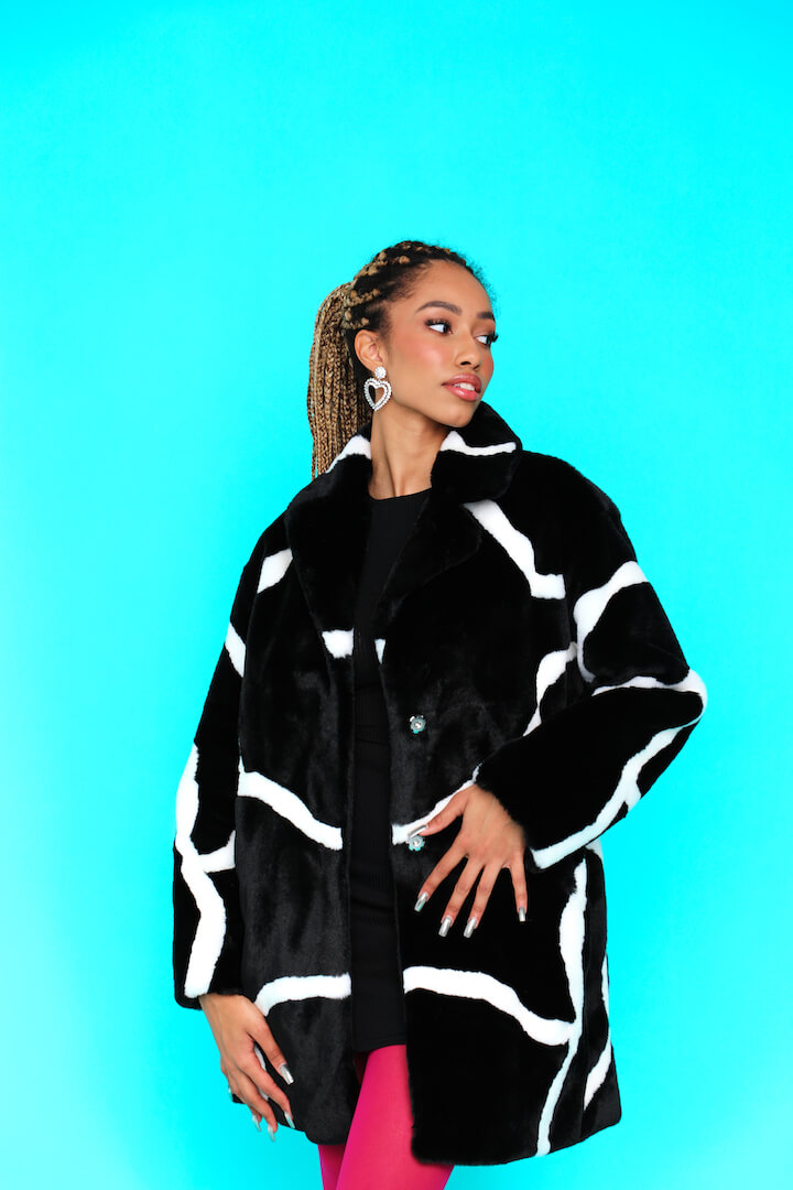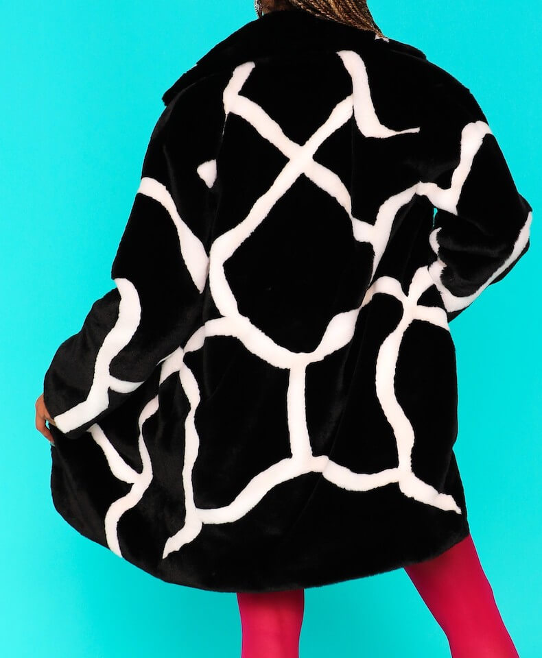 Ιταλική συνθετική γούνα, με μακριά μανίκια και άσπρο-μαύρο σχέδιο. Κλείνει με κουμπιά μπροστά.