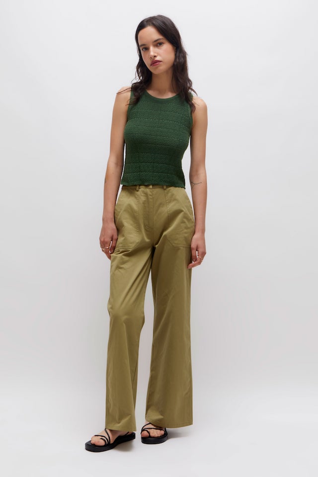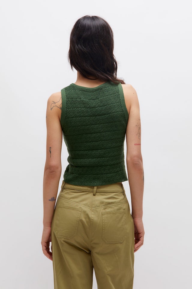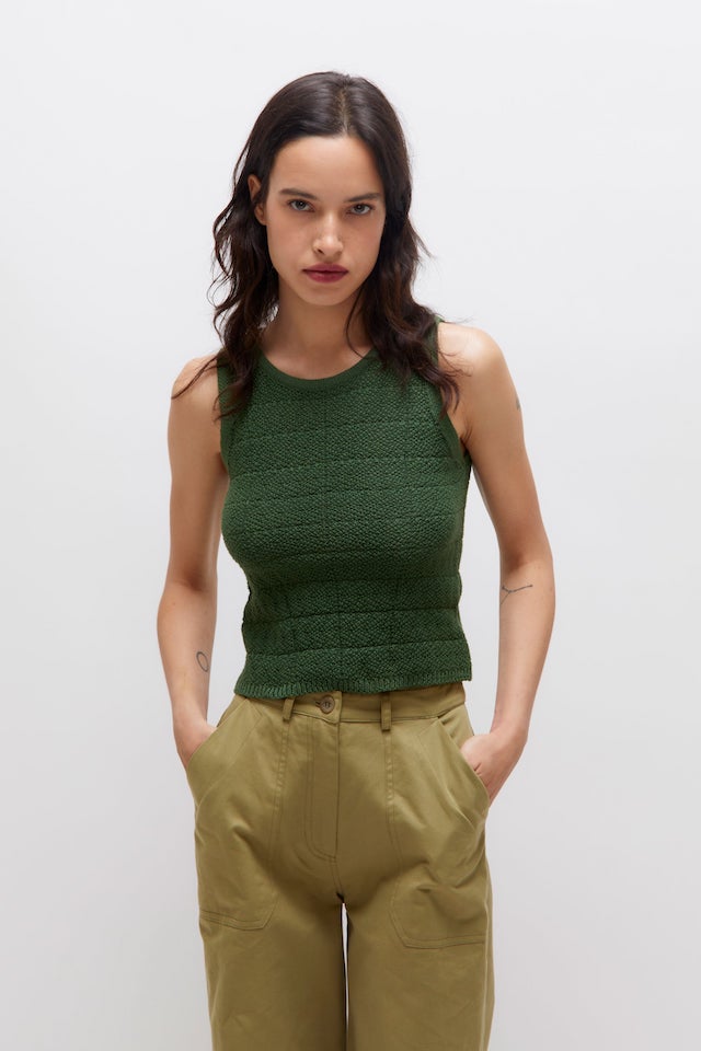 Πράσινο λεπτό πλεκτό τοπ. Με στρογγυλή λαιμόκοψη και αμάνικο. Το μοντέλο έχει ύψος 176 cm και φοράει νούμερο S.