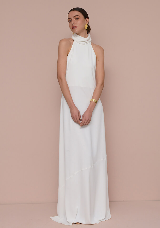 Μακρύ σατέν φόρεμα με ψηλό λαιμό που κλείνει πίσω με χρυσά κουμπιά και μικρό άνοιγμα στην πλάτη.
