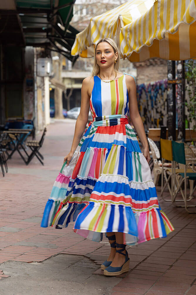 So Bohemians φόρεμα πλούσιο, με πολλά βολάν και συνδυασμός πολλών χρωμάτων.