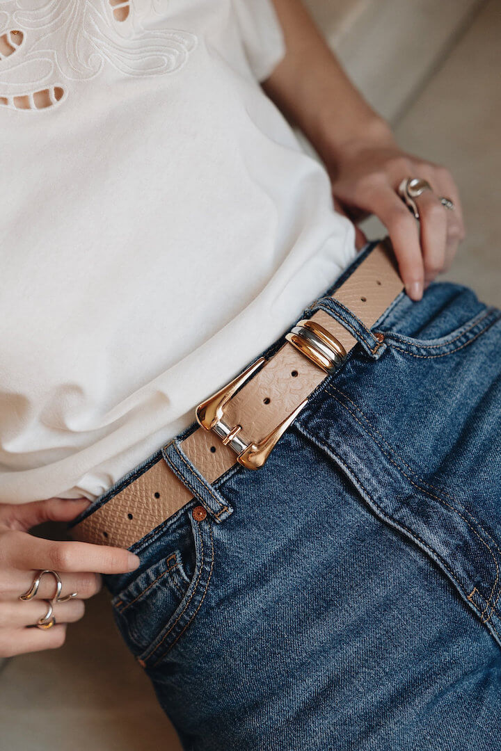 Χειροποίητη δερμάτινη ζώνη με χρυσά και νίκελ μεταλλικά στοιχεία.
