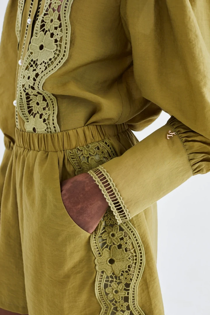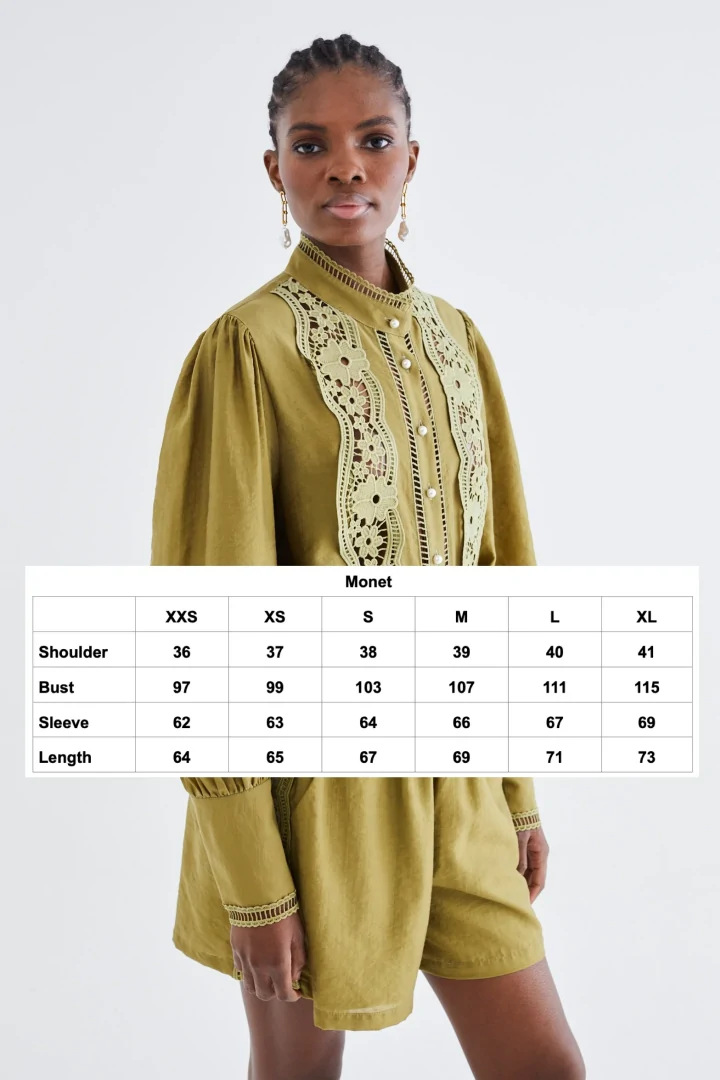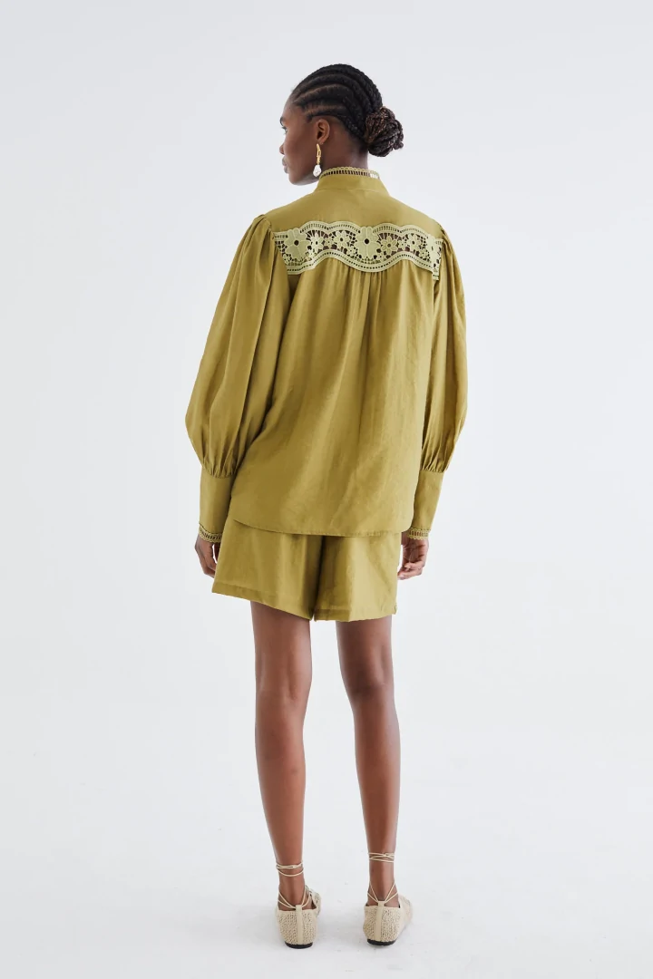 Ανανεώστε την γκαρνταρόμπα σας με την μπλούζα Monet σε λαδί χρώμα, με κομψά μακριά μανίκια και λεπτή δαντελένια λεπτομέρεια που προσθέτει μια εκλεπτυσμένη πινελιά. Σχεδιασμένη με κλασικό γιακά, αυτή η μπλούζα συνδυάζεται τέλεια με το ασορτί σορτς Sunata για μια συνεκτική, εκλεπτυσμένη εμφάνιση. Ιδανική για περιστάσεις όπου το διαχρονικό στυλ συναντά τη διακριτική θηλυκότητα.