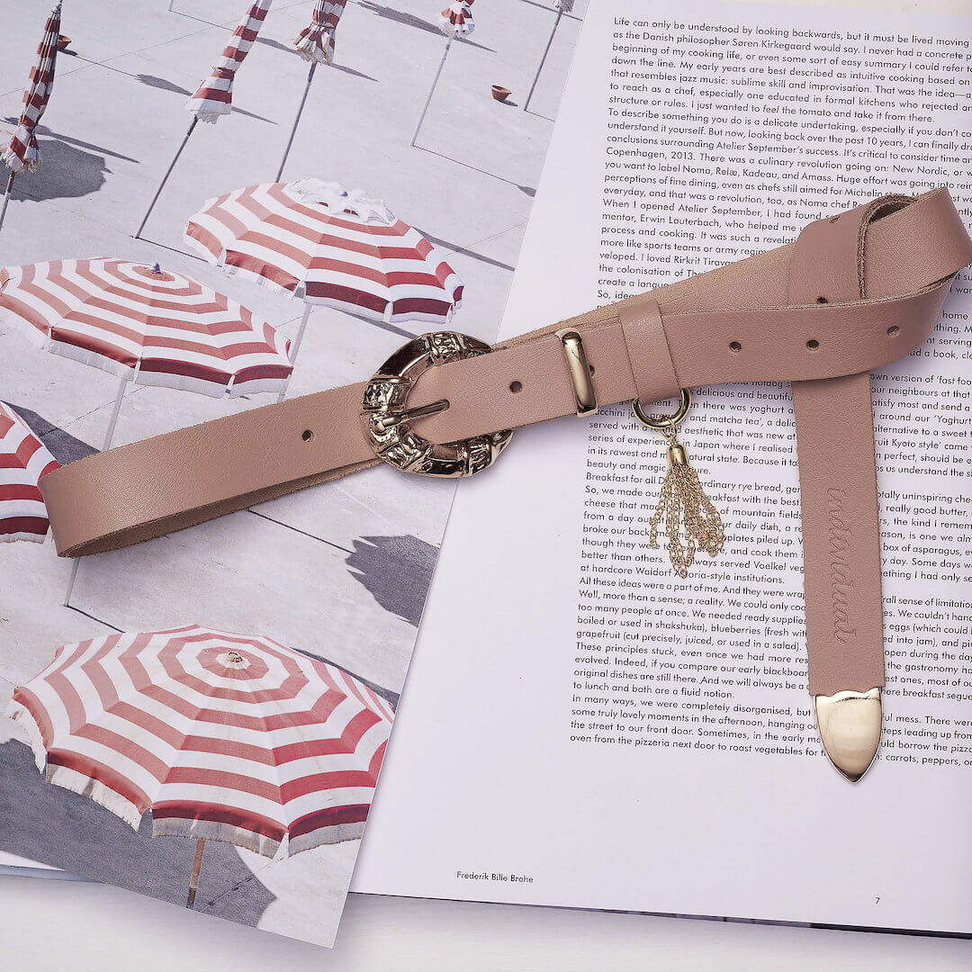 Χειροποίητη δερμάτινη ζώνη με χρυσά μεταλλικά στοιχεία.