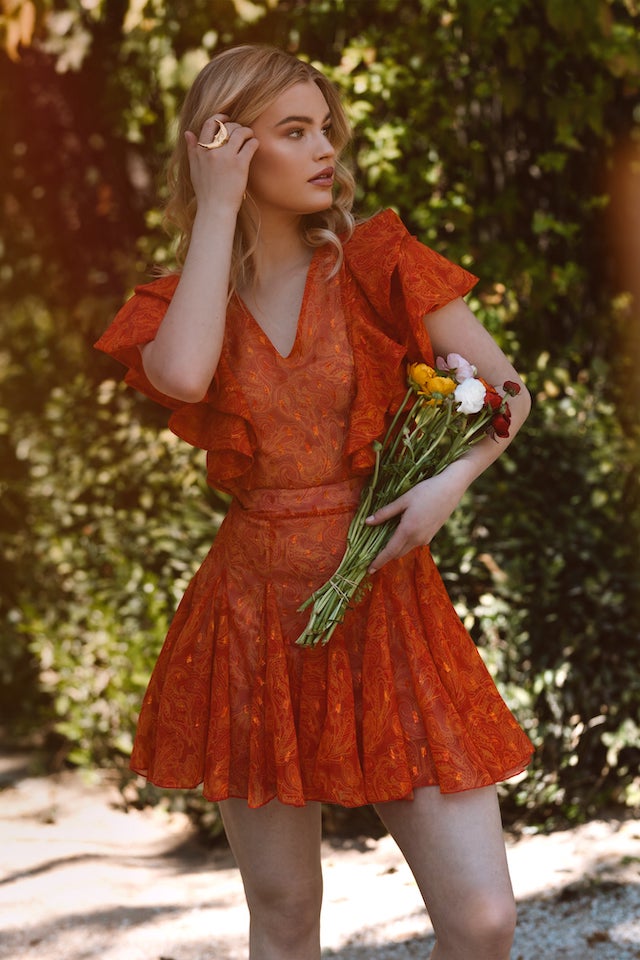 Μίνι φόρεμα με βολάν στους ώμους και βολάν στη φούστα.