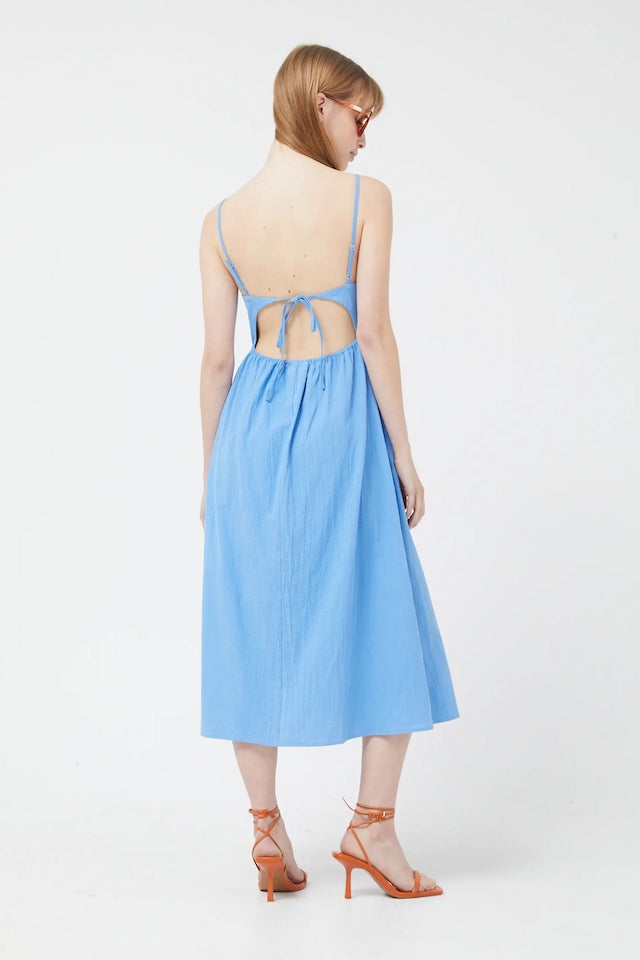 Compania Fantastica, μακρύ μπλε φόρεμα. Μπροστά έχει διακοσμητικά κουμπιά, ελαστική μέση και πίσω ανοικτή πλάτη με φιόγκο.