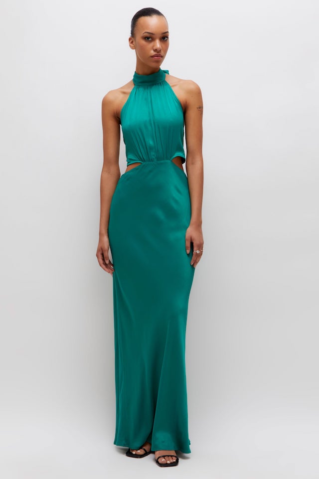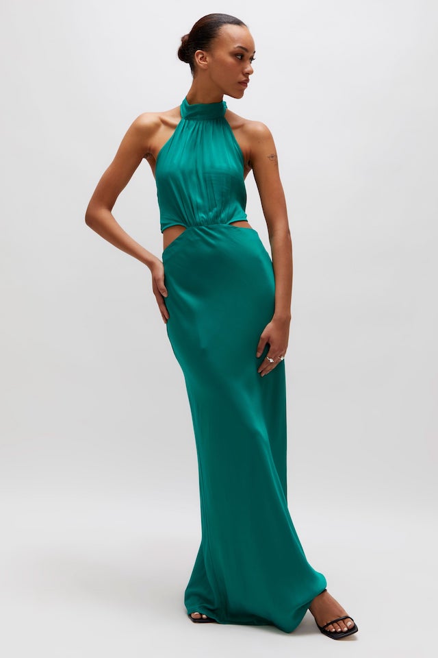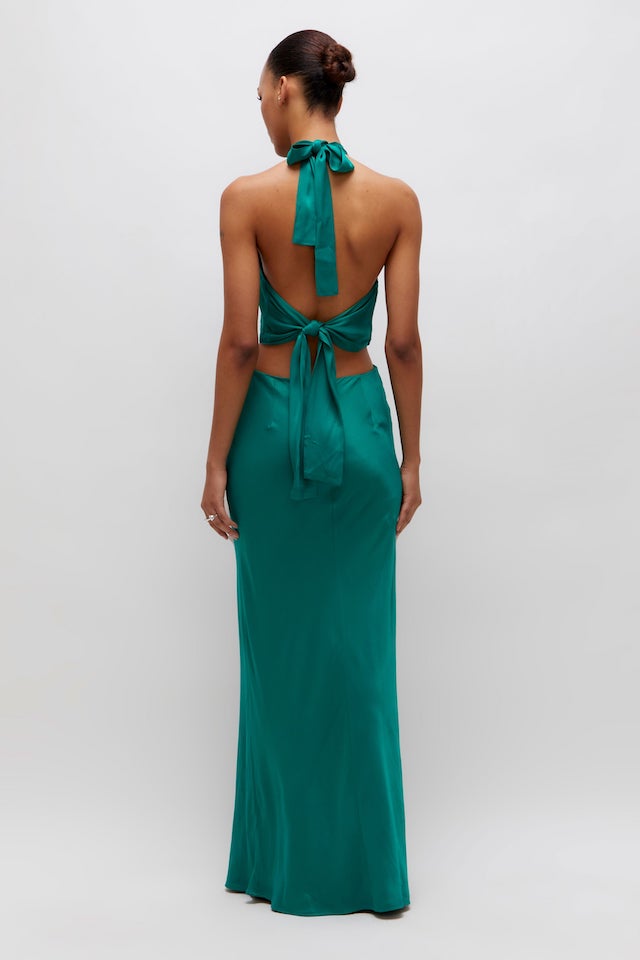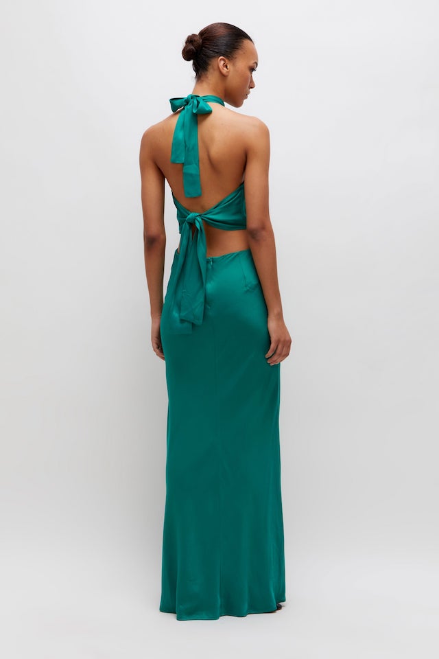 Μακρύ φόρεμα από πράσινο σατέν ύφασμα. Με ψηλό λαιμό και αμάνικο. Μοντέλο με μακριές φαρδιές τιράντες για δέσιμο στο πίσω μέρος. Χαμηλή πλάτη. Κλείσιμο με αόρατο φερμουάρ. Το μοντέλο έχει ύψος 176 cm και φοράει νούμερο S.