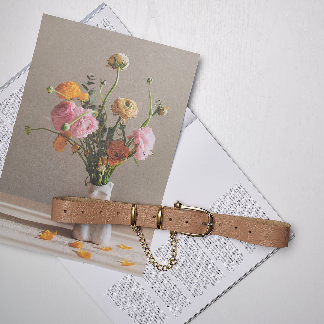 Χειροποίητη δερμάτινη ζώνη με χρυσά μεταλλικά στοιχεία και αλυσίδα.