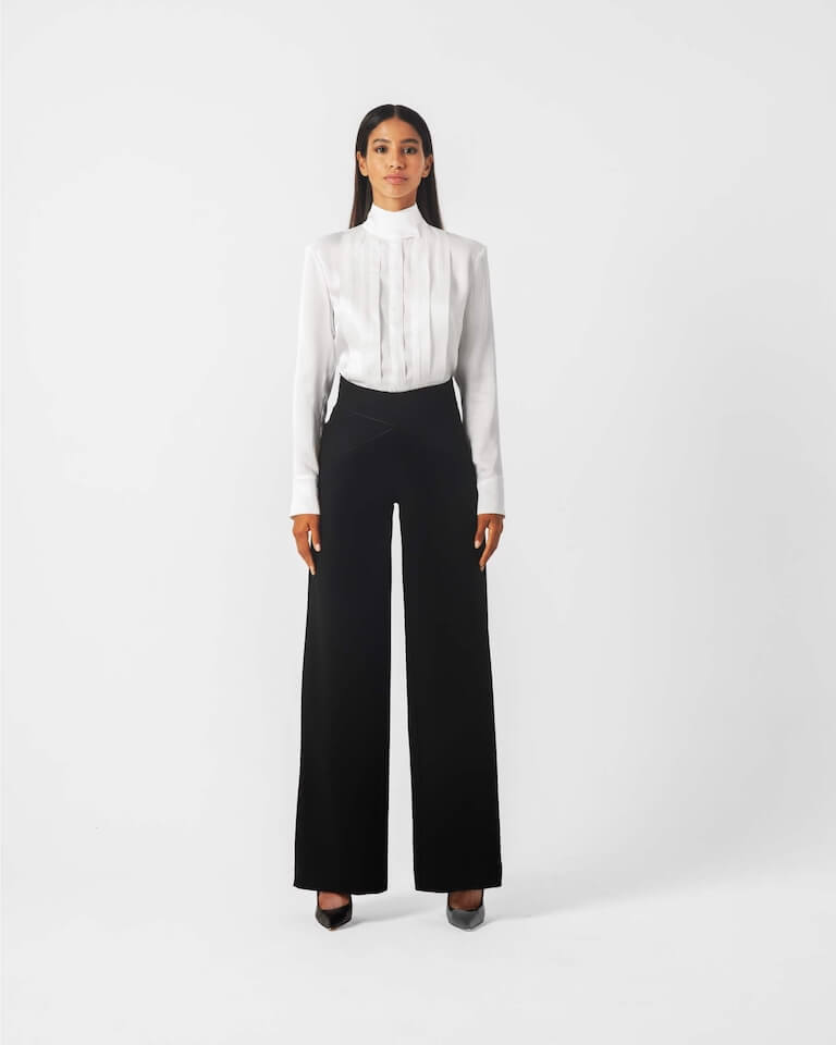 Υπέροχο ψηλόμεσο παντελόνι που αγκαλιάζει τις καμπύλες του σώματος, δίνοντας ένα θηλυκό και στιλάτο αποτέλεσμα.