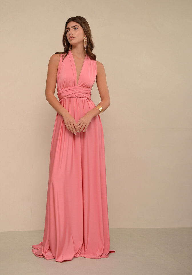 Μακρύ φόρεμα από ελαστικό crystal ύφασμα με δέσιμο στο λαιμό, ανοιχτή πλάτη και βαθύ V.