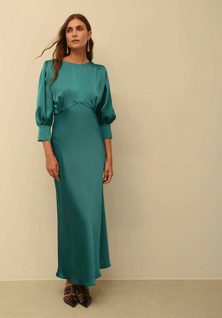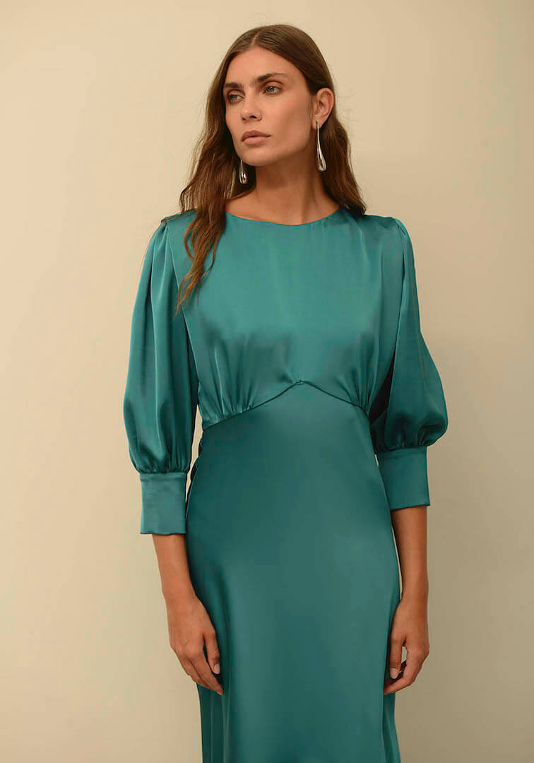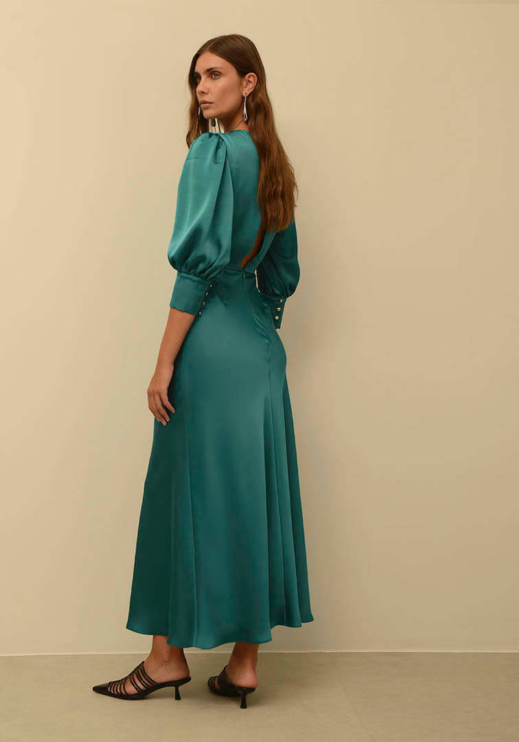 Μίντι κομψό φόρεμα από σατέν ύφασμα με μανίκια 3/4. Φερμουάρ στο πίσω μέρος και λεπτομέρεις με χρυσά κουμπιά πίσω στον λαιμό και στα μανίκια.