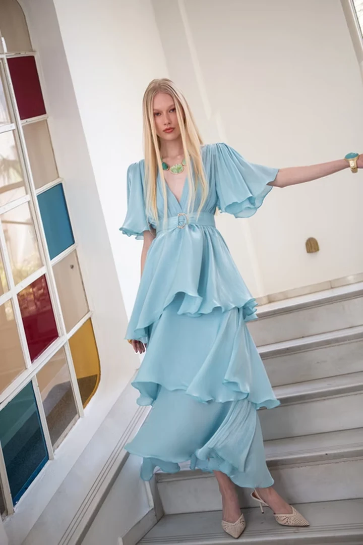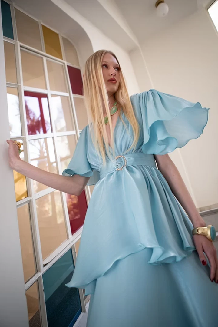 Εξασφαλίστε μια πραγματικά ακαταμάχητη εμφάνιση στις πιο ξεχωριστές σας στιγμές με το εκθαμβωτικό Sarah Dress σε δροσερή Aqua απόχρωση από την Nazezhda. Αυτό το εντυπωσιακό γυναικείο maxi φόρεμα είναι αριστοτεχνικά κατασκευασμένο από 100% ανακυκλωμένο πολυεστέρα, δημιουργώντας μια πολυτελή μεταλλική οργάντζα που ακτινοβολεί διακριτικά στο φως. Ο επιβλητικός του σχεδιασμός ξεχωρίζει χάρη στους έντονους ώμους με βάτες και το περίτεχνο ντραπάρισμα, ενώ τα αέρινα, εβαζέ καμπανωτά μανίκια προσδίδουν μια έντονη δόση ρομαντισμού. Διαθέτει άκρως θηλυκή κρουαζέ γραμμή με μαλακό λάστιχο στη μέση για άνετη εφαρμογή, και συνοδεύεται από ζώνη του ίδιου υφάσματος με μεταλλική τόκα που σμιλεύει άψογα τη σιλουέτα. Η απόλυτη μαγεία του κρύβεται στο κάτω μέρος, το οποίο ολοκληρώνεται με ένα εντυπωσιακό τριπλό ασύμμετρο βολάν, χαρίζοντας θεαματική κίνηση και χάρη σε κάθε σας βήμα. Το ιδανικό formal ρούχο για να μαγνητίσετε τα βλέμματα σε γάμους, βαφτίσεις και πολυτελή events.