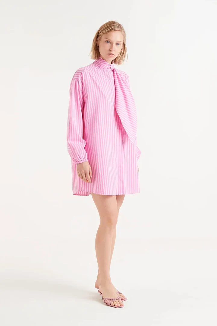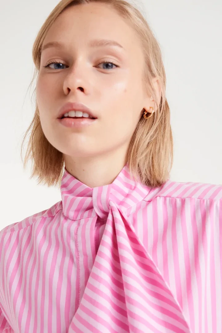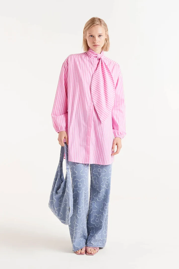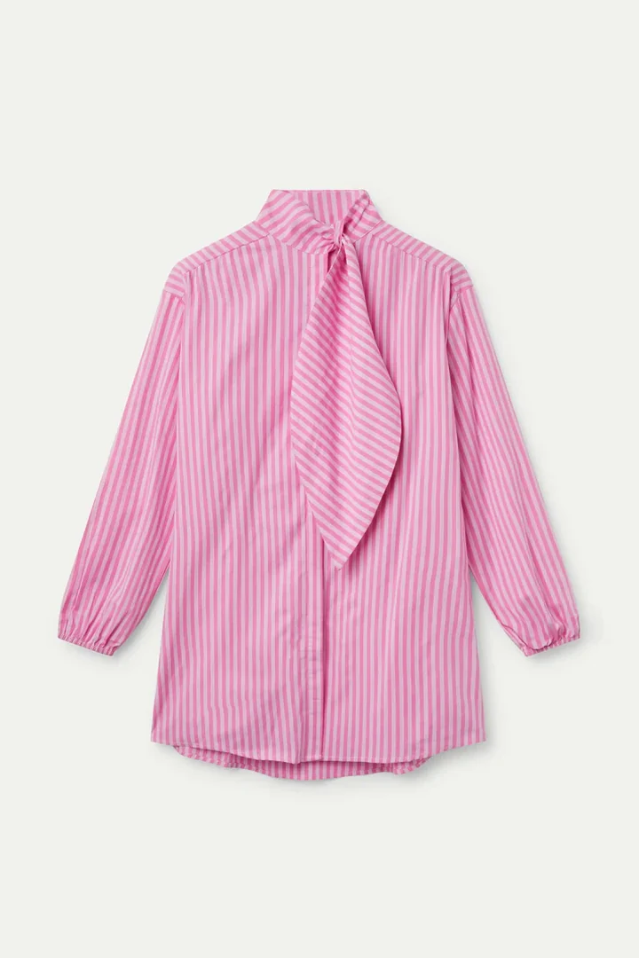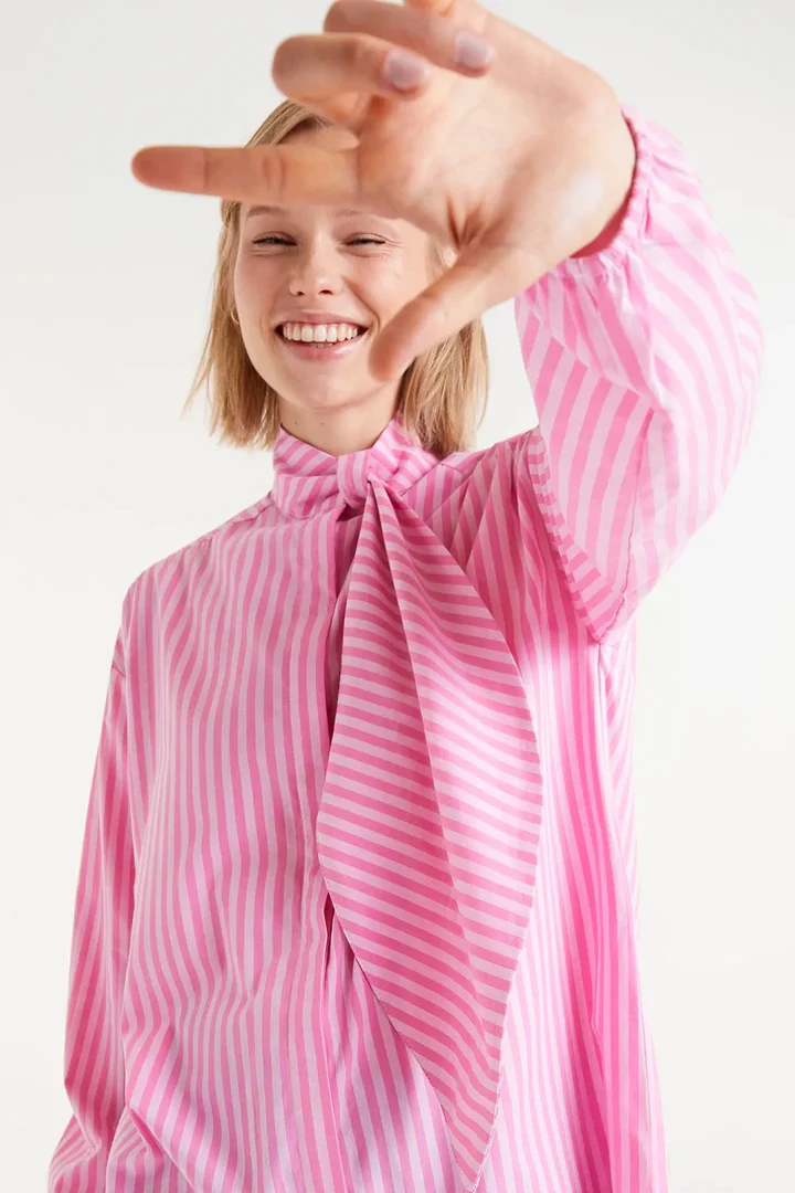 Oversized shirt with pink and white striped print. With extra-large bow collar and long puffed sleeves finished with elastic. Front button closure.