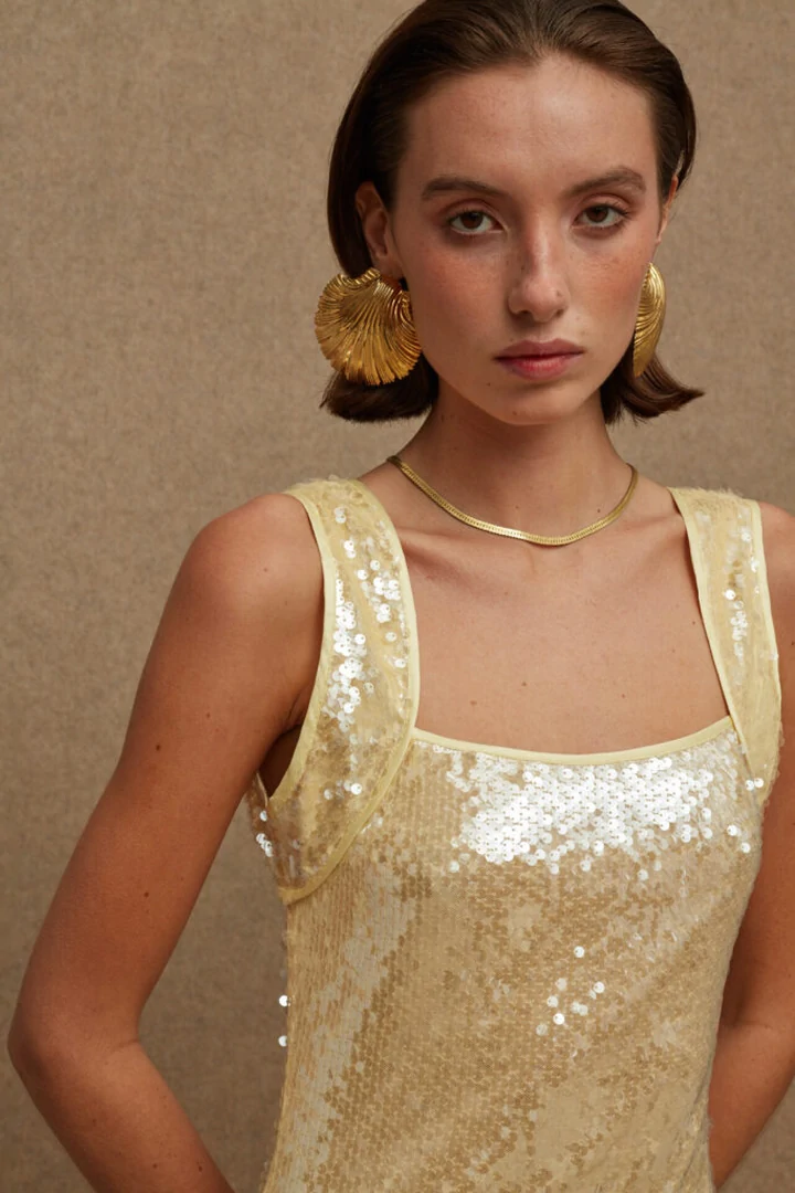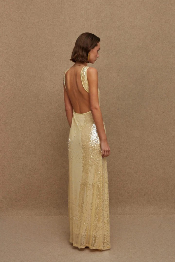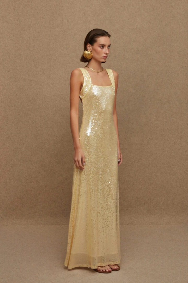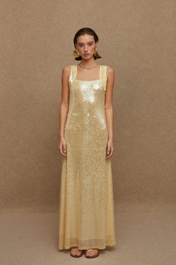 Ένα μάξι φόρεμα με πούλιες, ανοιχτή πλάτη και τετράγωνο ντεκολτέ. Ιδανικό για την πρόσκληση σε καλοκαιρινό γκαλά.