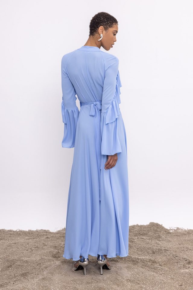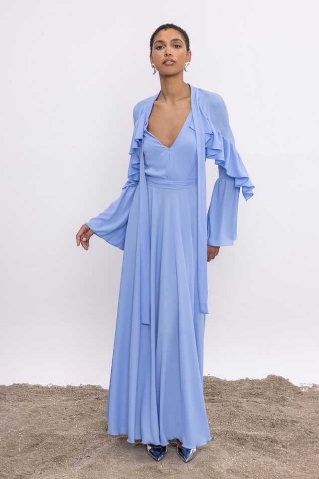 Αφεθείτε στη διαχρονική κομψότητα με αυτό το εξαίσιο μάξι μπλε φόρεμα, σχεδιασμένο για να μαγνητίζει την προσοχή σε κάθε επίσημη περίσταση. Φτιαγμένο από πολυτελές ύφασμα, το φόρεμα ντύνεται με χάρη, δημιουργώντας μια σιλουέτα που αποπνέει κομψότητα και ισορροπία. Τα μακριά μανίκια είναι διακοσμημένα με μοναδικά βολάν, προσθέτοντας μια πινελιά ιδιοτροπίας και ρομαντισμού στο σύνολο. Η λαιμόκοψη V επιμηκύνει τη λαιμόκοψη, ενώ η ευέλικτη λαιμόκοψη επιτρέπει εξατομικευμένες επιλογές στυλ, είτε δεμένες σε ένα λεπτό φιόγκο είτε αφήνονται χαλαρά για πιο χαλαρή εμφάνιση. Ολοκληρωμένο με διακριτικό φερμουάρ στην πλάτη για ευκολία στη χρήση, αυτό το φόρεμα συνδυάζει άψογα το στυλ και τη λειτουργικότητα. Είτε παρευρεθείτε σε ένα γκαλά, σε γάμο ή σε οποιαδήποτε άλλη ειδική εκδήλωση, αυτό το φόρεμα είναι βέβαιο ότι θα αφήσει μια μόνιμη εντύπωση με τη συγκρατημένη αίγλη και την εκλεπτυσμένη γοητεία του.