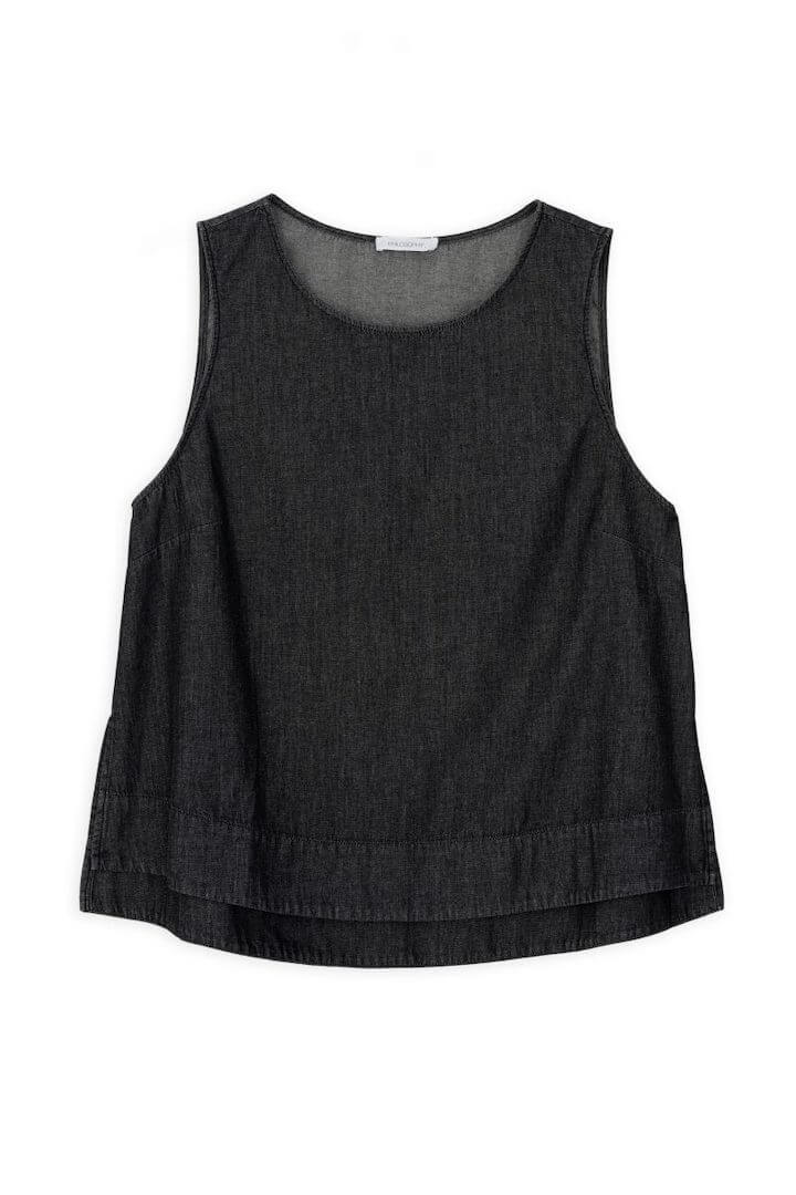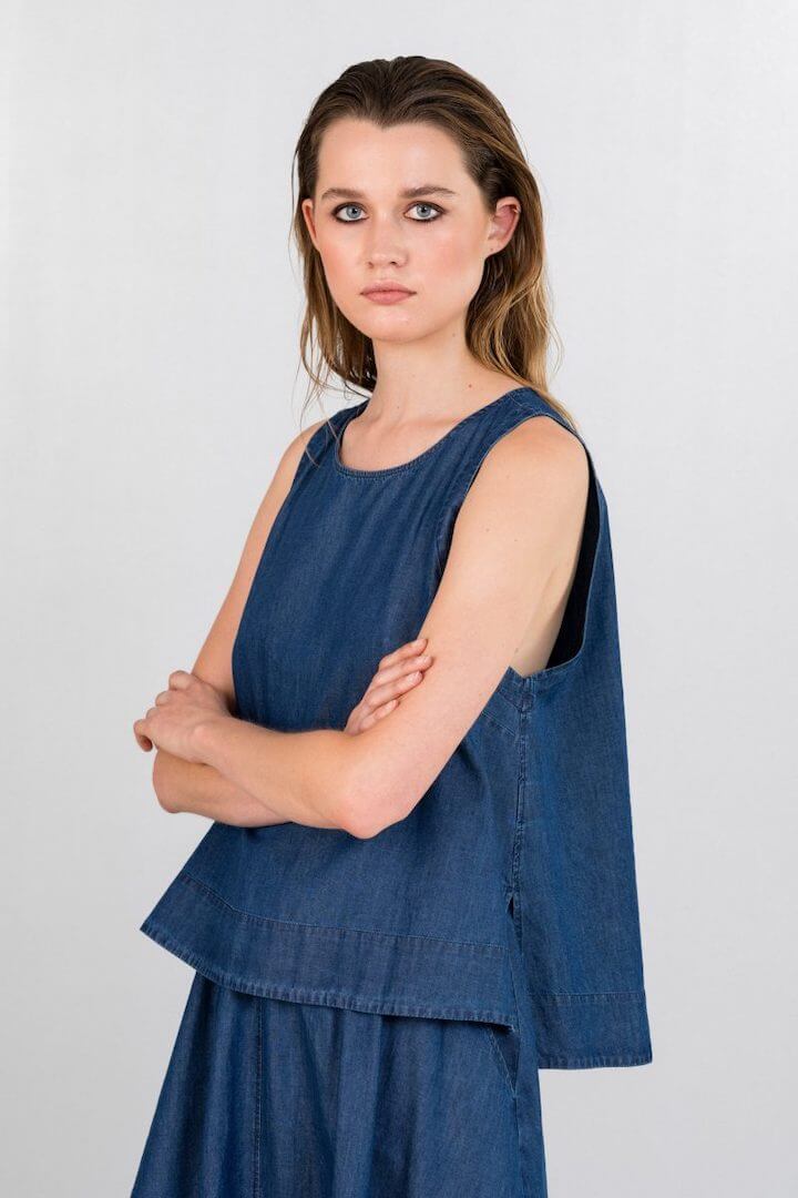 Philosophy cropped top denim, αμάνικο με στρογγυλή λαιμόκοψη.