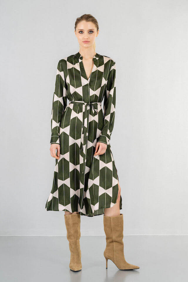 Philosophy midi σατέν φόρεμα, μακριά μανίκια και λαιμόκοψη σε σχήμα V. Ζώνη από το ίδιο ύφασμα.