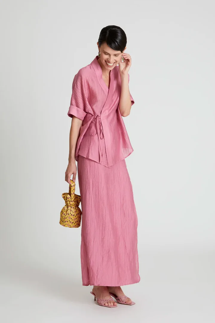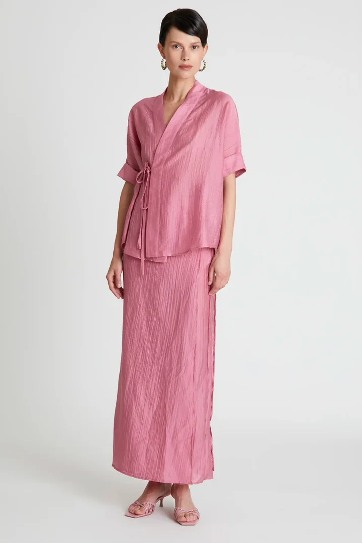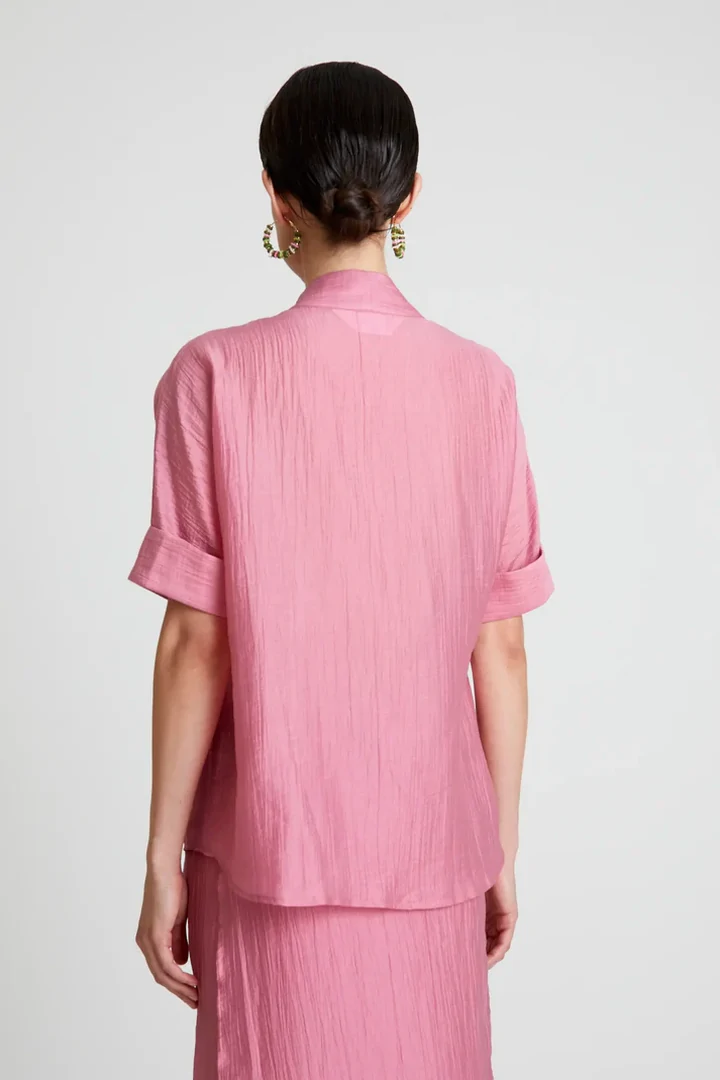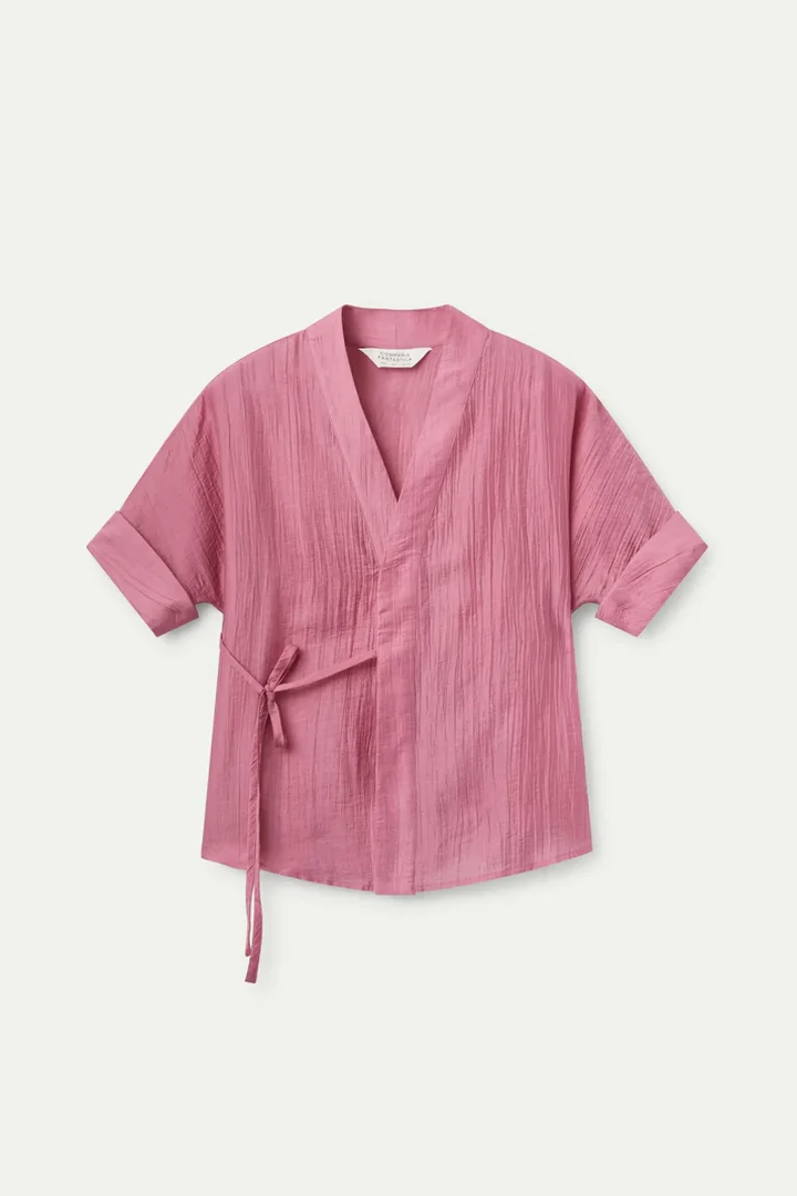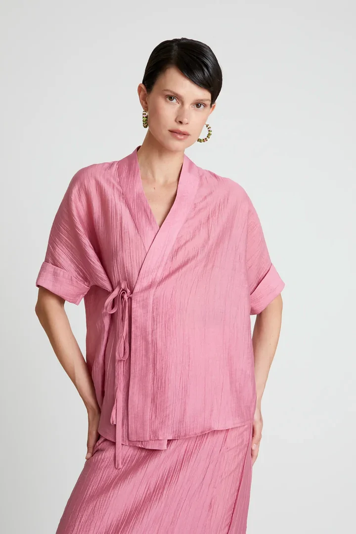 Textured pink crepe shirt with a V-neck and short sleeves. Kimono-style wrap style with a side tie.