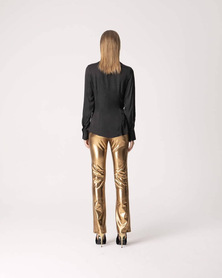 Υπέροχο ψηλό μέσο κολάν από εξαιρετικής ποιότητας ύφανση. Εφαρμοστή γραμμή με λάστιχο στη μέση και μπροστινό άνοιγμα στο τελείωμα. Ένα μοντέρνο κολάν σε κλασσικά έντονα χρώματα σε μαύρο και χρυσό για μοναδικούς συνδυασμούς από το πρωί έως το βράδυ.