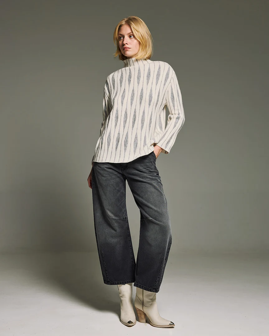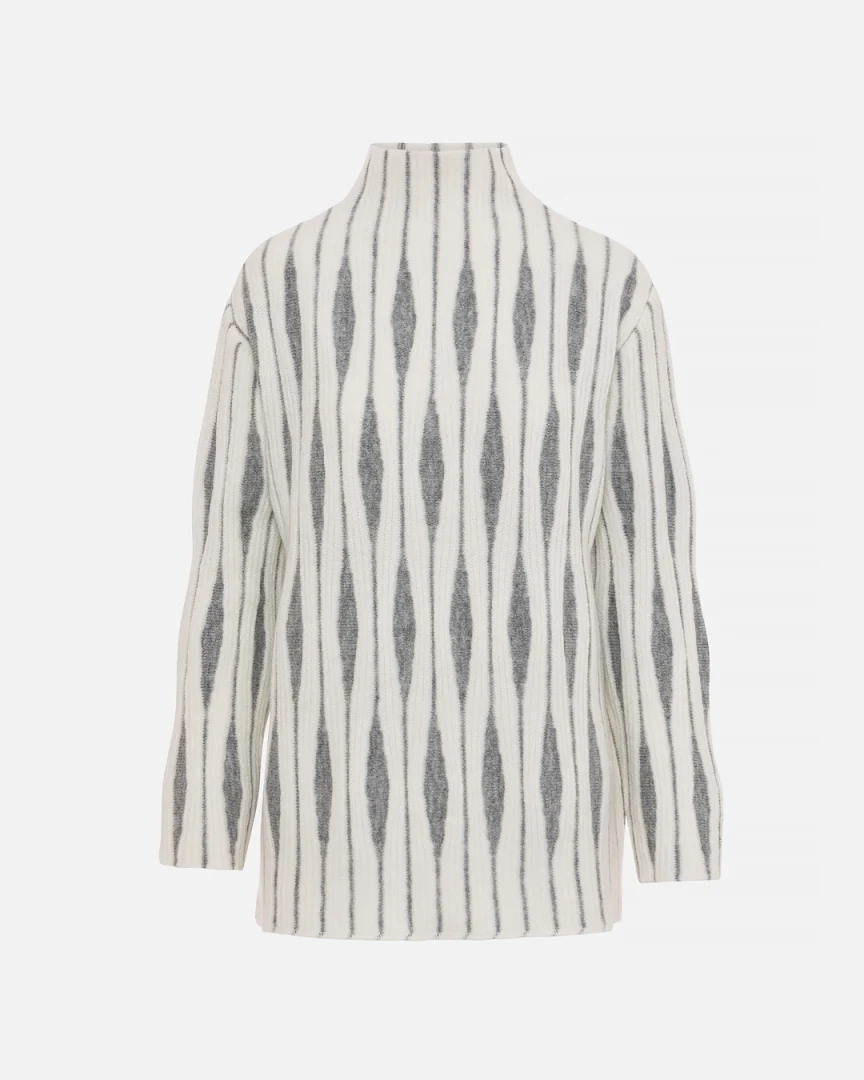 Είναι ένα oversized highneck εξαιρετικής ποιότητας και υφής πλεκτό που δεν τσιμπάει και δεν ενοχλεί καθόλου το δέρμα. Μπορείτε να το φορέσετε με πολλούς τρόπους από το πρωί ως το βράδυ. Έχει ανάγλυφη πλέξει που σχεδιάζει ρόμβο.