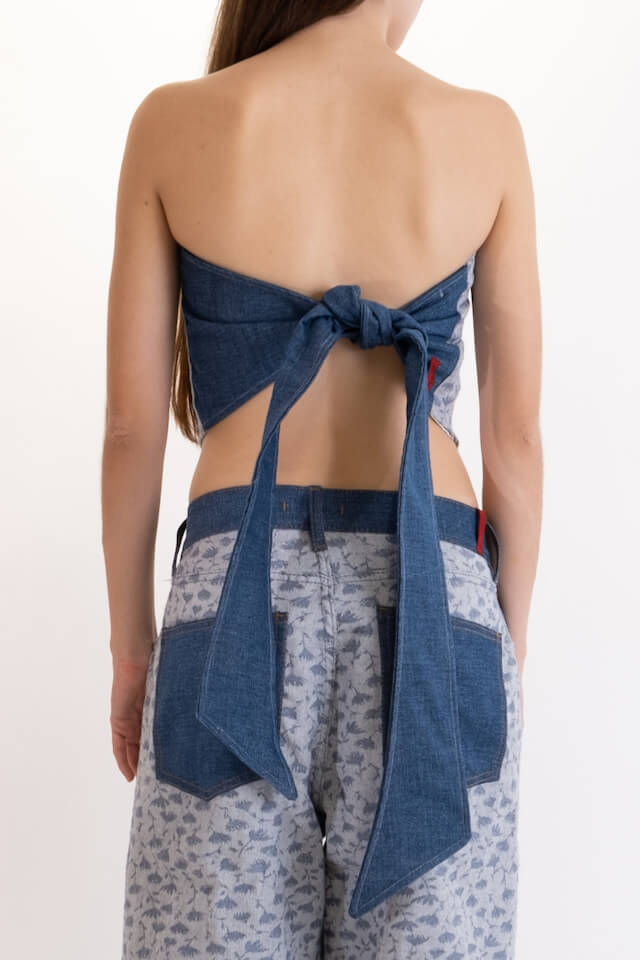 Το Savina αποτελεί ένα συνδυασμό της casual γοητείας του τζιν με την θυληκότητα ενός μπουστιέ. Απλό και chic, δένει πίσω από την πλάτη και συνδυάζεται εύκολα με high-rise denim shorts ή mid-rise denim pants για ένα total denim look.