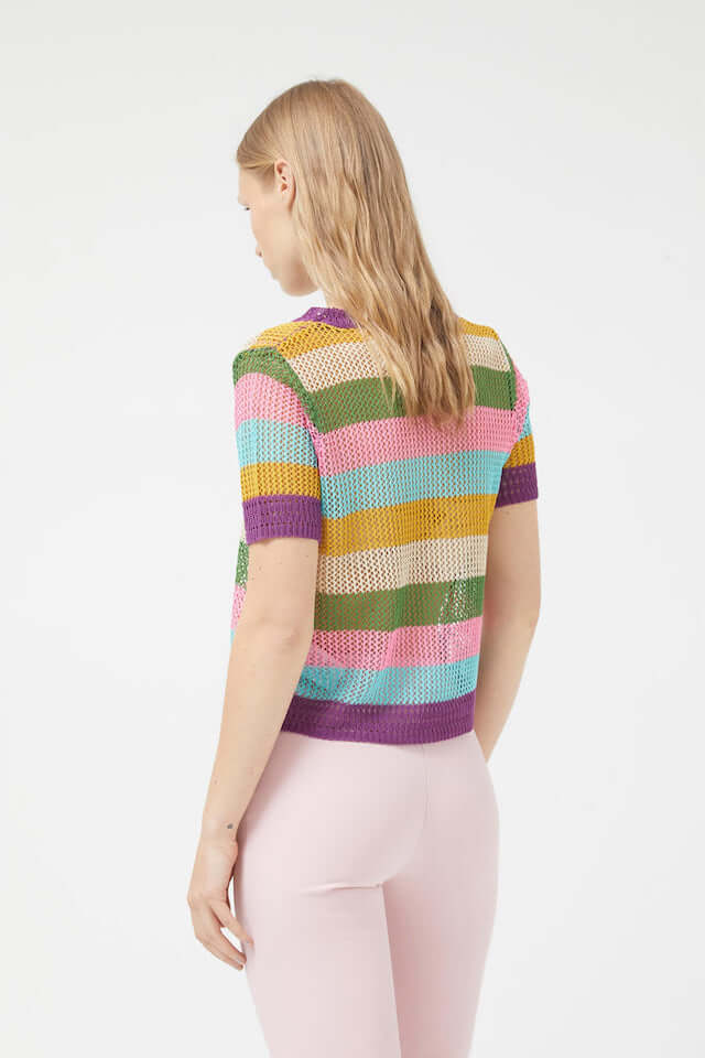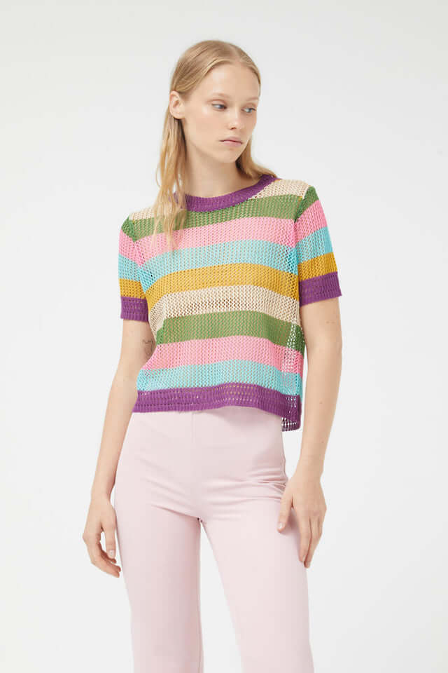 Ανοιχτό πλεκτό τοπ με πολύχρωμη ριγέ στάμπα. Με στρογγυλή λαιμόκοψη και κοντά μανίκια. Το μοντέλο έχει ύψος 174 cm και φοράει νούμερο S.