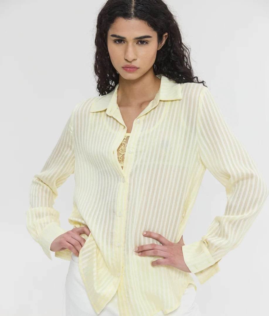 Αναβάθμισε το καθημερινό σου στυλ με το γυναικείο ημιδιάφανο πουκάμισο SUNSETGO σε απαλή κίτρινη απόχρωση. Κατασκευασμένο από ελαφρύ ύφασμα viscose και modal, προσφέρει άνεση και δροσερή αίσθηση, ιδανική για τις ανοιξιάτικες και καλοκαιρινές ημέρες.