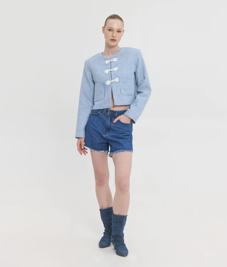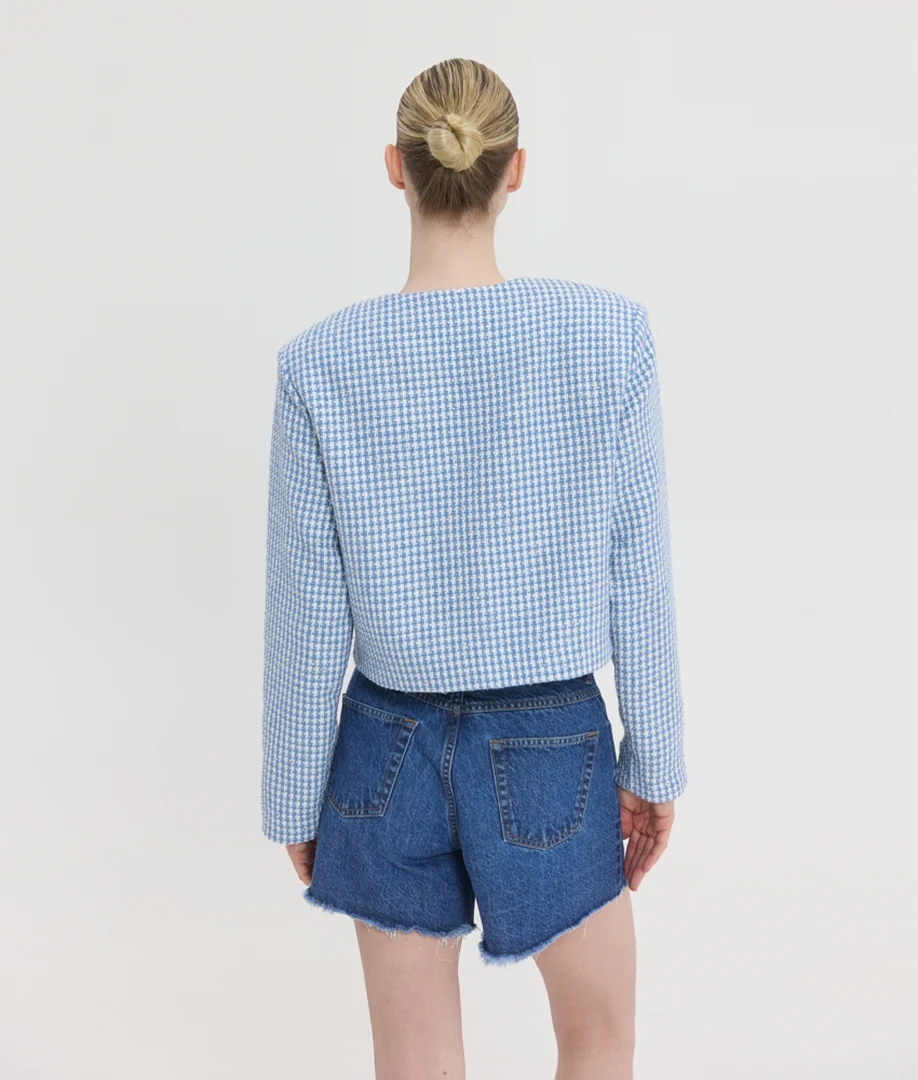 Αναδείξτε το προσωπικό σας στιλ με το Lucie Jacket από τη Sunsetgo, ένα statement πανωφόρι που επαναπροσδιορίζει τη διαχρονική κομψότητα. Αυτό το εντυπωσιακό γυναικείο τουίντ σακάκι (tweed blazer) έρχεται σε μια υπέροχη, παστέλ γαλάζια (ciel) απόχρωση, αποτελώντας την ιδανική επιλογή για να φωτίσετε τα ανοιξιάτικα σύνολά σας. Διαθέτει ενσωματωμένες βάτες στους ώμους (shoulder pads) που του χαρίζουν μια αυστηρή, δομημένη σιλουέτα, προσδίδοντας δυναμισμό και αυτοπεποίθηση σε κάθε σας εμφάνιση. Ο προσεγμένος σχεδιασμός του ολοκληρώνεται με κομψό κλείσιμο με κουμπιά στο μπροστινό μέρος. Κατασκευασμένο από 100% πολυεστέρα, εξασφαλίζει εξαιρετική ανθεκτικότητα στο χρόνο και άψογη, σταθερή εφαρμογή που δεν χάνει τη φόρμα της. Φορέστε το πάνω από basic t-shirts για να δημιουργήσετε τα πιο εκλεπτυσμένα office looks, ή συνδυάστε το με denim παντελόνια για εντυπωσιακές casual chic εξόδους.