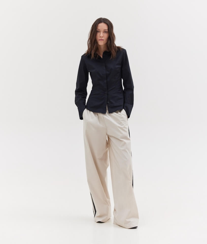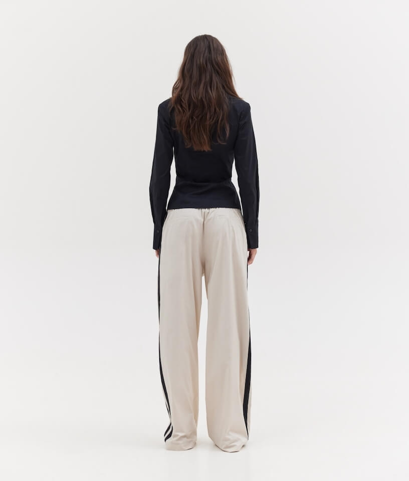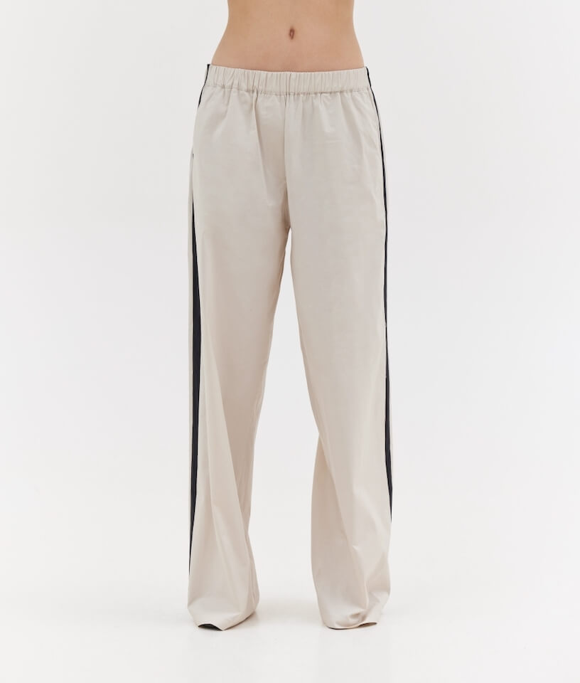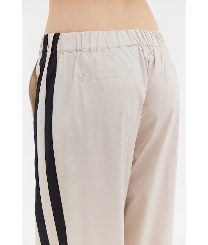 Παντελόνα σε φαρδιά γραμμη με ελαστική μέση και ρίγα στο πλαϊ. Πλαϊνές και πίσω τσέπες.