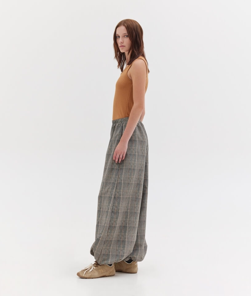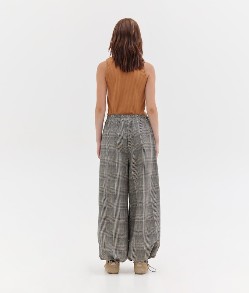 Παντελόνι σε φαρδιά γραμμή (loose fit). Κλείσιμο με λάστιχο στο τελείωμα.