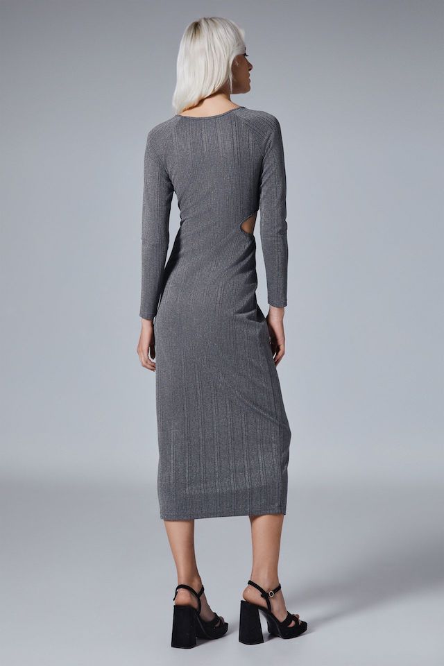 To Wanderlust Silver Dress είναι το μακρυμάνικο ριπ φόρεμα, με κόψιμο στα πλάγια και εξαιρετική εφαρμογή που συνδυάζει λάμψη και άνεση.