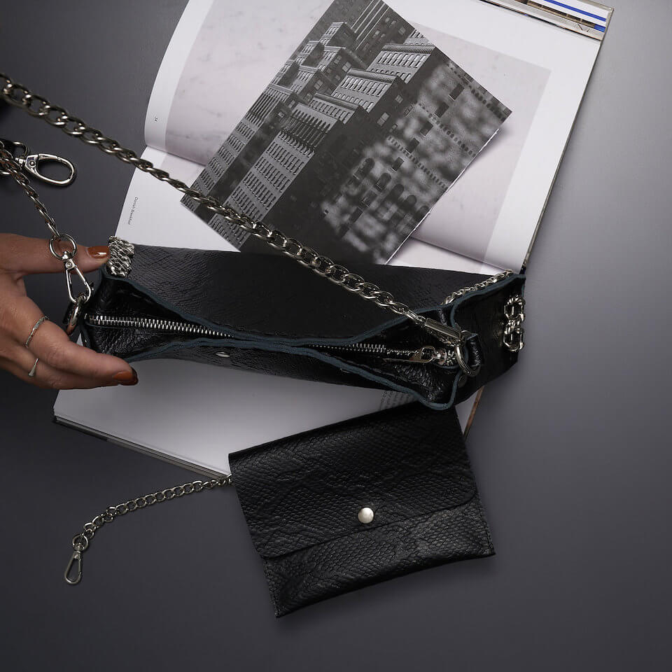 Χειροποίητη δερμάτινη τσάντα ώμου με κεντημένα νίκελ μεταλλικά σκαλιστά στοιχεία. Αποτελείται από δύο λουριά, ένα δερμάτινο με αυξομείωση και μία αλυσίδα. Κλείνει με φερμουάρ και περιλαμβάνει αποσπώμενο δερμάτινο πορτοφολάκι στο εσωτερικό της.
