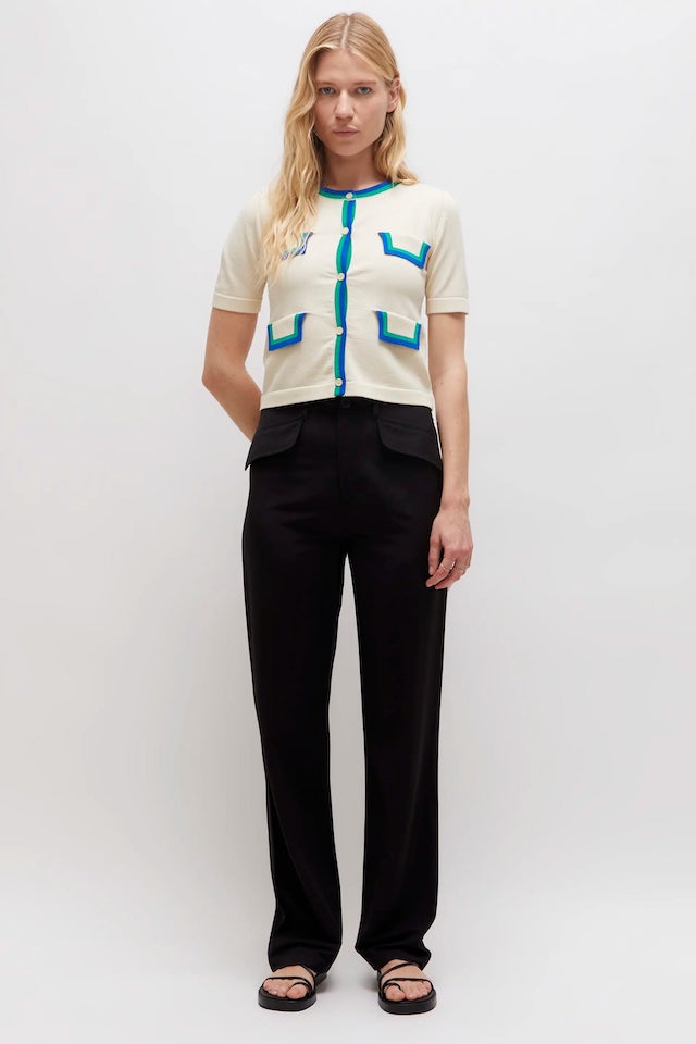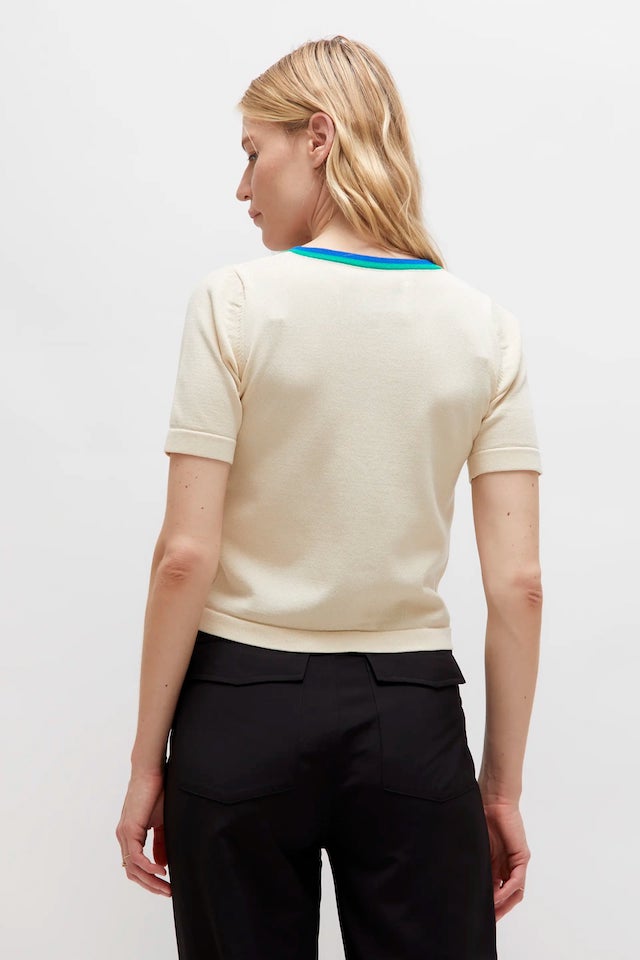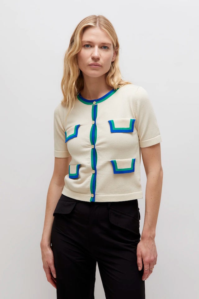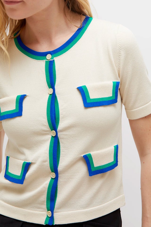 Λευκή πλεκτή ζακέτα με μπλε και πράσινες λεπτομέρειες ραφής. Με στρογγυλή λαιμόκοψη και κοντό μανίκι με μανσέτες. Κλείσιμο με κουμπί μπροστά. Λεπτομέρεια μπροστινής τσέπης. Το μοντέλο έχει ύψος 176 cm και φοράει νούμερο S.